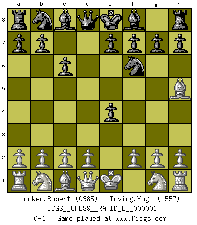 Last move : 0-1 2008 June 13 0:9:6 [Event "FICGS__CHESS__RAPID_E__000001"] [Site "FICGS"] [Date "2008.05.04"] [Round "1"] [White "Ancker,Robert"] [Black "Inving,Yugi"] [Result "0-1"] [WhiteElo "0985"] [BlackElo "1557"] 1.e4 d5 2.Bb5+ c6 3.Be2 dxe4 4.Bh5 Nf6 0-1 This chess game has been lost on time (started : 2008.05.04 1:31:17) Scandinavian (centre counter) defense Player Black won this chess game. Follow this game move after move (download)When in doubt... play Chess ! (Tevis) Gewinnen beim Schach fördert das Selbstvertrauen. Beim Sex spüre ich sowas nicht... (Garry Kasparov) Un jugador que trata de regresar una movida en el Ajedrez es un futuro carterista. (Richard Fenton) Les échecs sont plus proches de l'art de l'assassinat que de l'art de la guerre. (Arturo Perez-Reverte) O divine art of subtlety and secrecy! Through you we learn to be invisible, through you inaudible and hence we can hold the enemy's fate in our hands. (Sun Tzu)