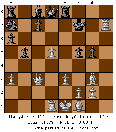 Last move : 1-0 2008 August 4 8:23:58 [Event "FICGS__CHESS__RAPID_E__000001"] [Site "FICGS"] [Date "2008.05.04"] [Round "1"] [White "Mach,Jiri"] [Black "Barradas,Anderson"] [Result "1-0"] [WhiteElo "1112"] [BlackElo "1171"] 1.c4 Nf6 2.Nc3 e6 3.Nf3 d5 4.d4 Bb4 5.Bg5 Nc6 6.e3 O-O 7.a3 Bxc3+ 8.bxc3 h6 9.Bh4 g5 10.Bg3 Ne4 11.Nd2 Nxc3 12.Qc2 Ne4 13.Nxe4 dxe4 14.Qxe4 f5 15.Qd3 a6 16.h4 b6 17.hxg5 hxg5 18.Rd1 b5 19.d5 exd5 20.cxd5 Na7 21.Qc3 Re8 22.Rh8+ Kf7 23.Rh7+ 1-0 English Opening Kingside Castling by player Black (move 6) Player White won this chess game. Follow this game move after move (download)A good sacrifice is one that is not necessarily sound but leaves your opponent dazed and confused. (Rudolph Spielmann) Wenn Du nicht kämpfst, um anderen etwas zu beweisen, sondern nur für Dich selbst, dann bist du fast unbesiegbar. (Garry Kasparov) ¿Quién es tu oponente esta tarde? Esta tarde mi oponente son las piezas negras. (Akiba Rubinstein) Tous ces prétendus hommes politiques sont les pions, les Cavaliers, les Tours ou les Fous d'une partie d'échecs qui se jouera tant qu'un hasard ne renversera pas l'échiquier. (Honoré de Balzac) The ego is not master in its own house. (Sigmund Freud)