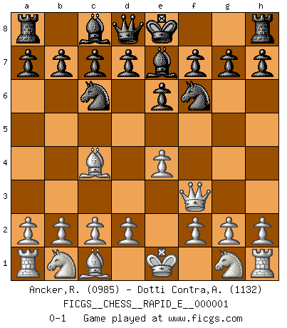 Last move : 0-1 2008 June 22 13:1:29 [Event "FICGS__CHESS__RAPID_E__000001"] [Site "FICGS"] [Date "2008.05.04"] [Round "1"] [White "Ancker,Robert"] [Black "Dotti Contra,Alessandro"] [Result "0-1"] [WhiteElo "0985"] [BlackElo "1132"] 1.e4 Nc6 2.Bc4 e6 3.Qh5 Nf6 4.Qf3 Be7 0-1 This chess game has been lost on time (started : 2008.05.04 1:31:17) KP : Nimzovich defense Player Black won this chess game. Follow this game move after move (download)What is the difference between chess and football? Everybody understands football, but nobody plays it. Everybody plays chess, but nobody understands it. Everything is relative. (Vladimir Kramnik) Der Freibauer hat für mich eine Seele, genau wie der Mensch, Wünsche, die unerkannt in ihm schlummern, und Befürchtungen, von deren Existenz er selbst kaum ahnt. (Aaron Nimzowitsch) Hay dos clases de hombres: aquellos que se conforman en dejarse llevar por las circunstancias y que juegan barajas y aquellos decididos a controlar las circunstancias y que juegan al Ajedrez. (Mortimer Collins) On est toujours la mazette de quelqu'un d'autre. (Anonyme) The only sure thing about luck is that it will change. (Wilson Mizner)
