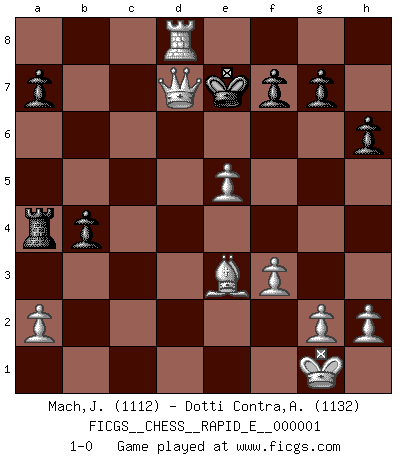 Last move : 1-0 2008 August 16 20:16:29 [Event "FICGS__CHESS__RAPID_E__000001"] [Site "FICGS"] [Date "2008.05.04"] [Round "1"] [White "Mach,Jiri"] [Black "Dotti Contra,Alessandro"] [Result "1-0"] [WhiteElo "1112"] [BlackElo "1132"] 1.d4 d5 2.c4 Nf6 3.cxd5 Bg4 4.f3 Bh5 5.e4 e6 6.Nc3 Bb4 7.Qa4+ Qd7 8.Qxb4 Qc8 9.Nge2 Na6 10.Qa3 c5 11.Nf4 O-O 12.Be3 c4 13.e5 Nxd5 14.Ncxd5 exd5 15.Nxh5 b5 16.Be2 Rb8 17.O-O b4 18.Qa4 Rb6 19.Nf4 c3 20.Nxd5 cxb2 21.Ne7+ Kh8 22.Nxc8 bxa1Q 23.Rxa1 Rxc8 24.Bxa6 R8c6 25.d5 Rxa6 26.dxc6 Rxa4 27.c7 h6 28.c8Q+ Kh7 29.Qf5+ Kg8 30.Rd1 Kf8 31.Rd8+ Ke7 32.Qd7+ 1-0 QGD : Marshall defense Kingside Castling by player Black (move 11) Kingside Castling by player White (move 17) Promotion Queen by player Black (move 22) Promotion Queen by player White (move 28) Player White won this chess game. Follow this game move after move (download)I play correspondence chess because it is both art and science while chess is art only. (A player at FICGS) Ich würde die 30 stärksten Spieler der USA im Simultanspiel besiegen. (José Raúl Capablanca) Algunos sacrificios son sólidos, los demás son míos. (Mikhail Tal) D'abord les bases : Jouez et étudiez, puis étudiez et jouez, ensuite jouez et étudiez, puis étudiez et jouez. Deuxièmement : Donnez toujours le meilleur de vous-même ! (Ken Smith) Don't be irreplaceable, if you can't be replaced, you can't be promoted. (Dan Rotaru)