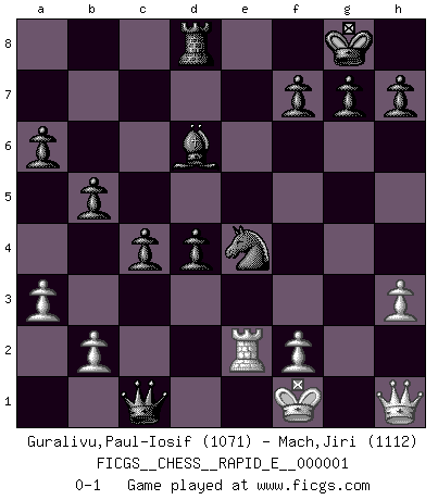 Last move : 0-1 2008 August 13 16:7:37 [Event "FICGS__CHESS__RAPID_E__000001"] [Site "FICGS"] [Date "2008.05.04"] [Round "1"] [White "Guralivu,Paul-Iosif"] [Black "Mach,Jiri"] [Result "0-1"] [WhiteElo "1071"] [BlackElo "1112"] 1.e4 e5 2.Nf3 Nc6 3.Bb5 a6 4.Ba4 Nf6 5.O-O Be7 6.Re1 b5 7.Bb3 d6 8.c3 O-O 9.d4 Bg4 10.Nbd2 exd4 11.cxd4 Nxd4 12.h3 Bh5 13.g4 Nxb3 14.Nxb3 Bg6 15.Bf4 Nxe4 16.Nbd4 Qd7 17.Rc1 c5 18.Nf5 Bxf5 19.gxf5 Qxf5 20.Bg3 Rfe8 21.Kg2 d5 22.Rc2 c4 23.Nd4 Qf6 24.Nf3 Bb4 25.R1e2 Rad8 26.Be5 Rxe5 27.Nxe5 Qxe5 28.a3 Bd6 29.Qh1 d4 30.Rc1 Qg5+ 31.Kf1 Qxc1+ 0-1 Ruy Lopez : Closed Kingside Castling by player White (move 5) Kingside Castling by player Black (move 8) Player Black won this chess game. Follow this game move after move (download)Chess books should be used as we use glasses: to assist the sight, although some players make use of them as if they thought they conferred sight. (Jose Raul Capablanca) Schach ist Leben. (Robert James Fischer) Dios mío, Bobby Fischer juega tan simple. (Alexei Suetin) Les Echecs sont et restent toujours un combat, un combat intégral comme la boxe, la lutte ou un autre sport, et où il doit y avoir un vainqueur et un vaincu. (Joseph Emil Diemer) History is the quarrels of popes and kings, with wars or pestilences in every page; the men all so good for nothing, and hardly any women at all. (Jane Austen)