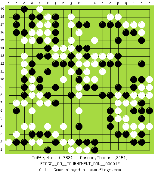 Last move : 0-1 2008 July 9 6:47:2 [Event "FICGS__GO__TOURNAMENT_DAN__000012"] [Site "FICGS"] [Date "2008.05.04"] [Round "1"] [Black "Ioffe,Nick"] [White "Connor,Thomas"] [Result "0-1"] [Rating 1 "1983"] [Rating 2 "2151"] 1.q16 d4 2.q3 d16 3.r9 g3 4.k4 q5 5.o4 r3 6.r2 r4 7.s2 r7 8.p9 s9 9.s10 s8 10.r10 f17 11.k17 r17 12.r16 q17 13.p17 p18 14.o17 o18 15.n17 s16 16.s15 s17 17.p15 c4 18.s5 t4 19.s6 p7 20.n8 c15 21.o6 q4 22.p3 t9 23.s7 r8 24.t6 p6 25.r6 p5 26.s3 s4 27.o5 d10 28.d7 f7 29.c10 c11 30.d11 c12 31.e10 d9 32.e9 e8 33.e13 j15 34.g16 j17 35.g17 k16 36.l17 k13 37.k11 g14 38.f14 g13 39.d17 e17 40.b16 c17 41.d18 c18 42.g18 f15 43.g15 j18 44.c9 d8 45.c8 b7 46.b6 c7 47.f11 d6 48.d12 c13 49.f3 f4 50.e3 h4 51.c2 b3 52.b2 a2 53.g2 h2 54.f1 d2 55.d3 e2 56.k2 j2 57.j8 m13 58.n12 m12 59.m11 n13 60.o12 o13 61.p13 p8 62.q8 q7 63.o8 t8 64.l14 m15 65.k14 j14 66.l13 l12 67.j13 k12 68.j12 h13 69.e15 f16 70.e18 e16 71.c16 d15 72.b18 f18 73.c19 e19 74.b17 l11 75.k10 l10 76.l9 m10 77.m9 n11 78.p12 j11 79.h12 h10 80.g12 k9 81.f13 h14 82.g9 k8 83.f8 e7 84.g7 t10 85.s12 k1 86.l2 l1 87.m1 j1 88.m2 k6 0-1 Here are the names of the openings (joseki) played in the four corners : Corner q16 : q16 r17 Hoshi (Hwajeom, Seongjeom, Xingwei`) 4-4 Point. The star or hoshi (4-4) point, emphasizing influence at the potential expense of territory. Player White won this Go (weiqi, baduk) game. Follow this game move after move (download)Grab the border points between two moyos. (Anonymous) It's not enough to succeed. Others must fail. (Gore Vidal)