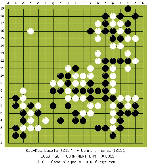 Last move : 1-0 2008 October 17 12:7:5 [Event "FICGS__GO__TOURNAMENT_DAN__000012 "] [Site "FICGS"] [Date "2008.05.04"] [Round "1"] [Black "Kis-Kos,Laszlo "] [White "Connor,Thomas "] [Result "1-0"] [Rating 1 "2137"] [Rating 2 "2151"] 1.r16 p17 2.m16 n15 3.p16 q16 4.q15 q17 5.o16 r15 6.r17 r18 7.s18 s15 8.q18 q14 9.p15 p18 10.r19 n16 11.o17 n17 12.o18 p14 13.r5 d16 14.c4 e3 15.h4 f4 16.e5 d4 17.c5 c3 18.b3 d5 19.d6 c6 20.b6 c7 21.b7 c8 22.c2 d3 23.g6 e6 24.b2 p4 25.q3 p3 26.q4 p5 27.l4 r6 28.s6 s7 29.q6 r7 30.q5 m5 31.n3 p8 32.o7 p6 33.p7 q7 34.s5 n6 35.o8 p9 36.o9 p10 37.m7 l5 38.k4 l7 39.l8 k7 40.k8 j7 41.g8 j8 42.o10 p11 43.j9 h9 44.h8 k9 45.j10 k10 46.k11 j11 47.h10 l10 48.m9 m11 49.o11 n12 50.o12 n13 51.p12 r11 52.r12 r13 53.k5 m6 54.q12 s12 55.p2 m8 56.n8 l9 57.m8 m10 58.o3 g9 59.j6 1-0 This go game has been lost on time (started : 2008.05.04 7:23:42) Here are the names of the openings (joseki) played in the four corners : Corner q16 : r16 p17Komoku (Somok, Xiao~mu`) 3-4 Point. The komoku (3-4) point is the traditional corner enclosure move..Ikken Kakari (Hankan Keolch'im, Yi Gua`jiao~, 1-Space Low Pincer). The small knight move is the basic approach move to the 3-4 point stone. It has been continually used for over four centuries. There are limitless variations, with new moves constantly being discovered. White 2 opens the door to a treaure store of joseki. Corner d4 : c4 e3Komoku (Somok, Xiao~mu`) 3-4 Point. The komoku (3-4) point is the traditional corner enclosure move..Ikken Kakari (Hankan Keolch'im, Yi Gua`jiao~, 1-Space Low Pincer). The small knight move is the basic approach move to the 3-4 point stone. It has been continually used for over four centuries. There are limitless variations, with new moves constantly being discovered. White 2 opens the door to a treaure store of joseki. Corner q4 : r5 p4Mokuhazushi (Waemok, Wai`mu`) 5-3 Point. The mokuhazushi (5-3) point was popular in the Edo period in Japan (1600 - 1867). It emphasizes influence; territorially, it is inferior to the 3-4 point.Takamoku Kakari. White prevents Black from gaining influence, but in the local context, abandoning profit in the corner entails a loss. Black 3-4 and 4-4 are best. Player Black won this Go (weiqi, baduk) game.Follow this game move after move (download ) Territory really exists only in the end. (Pierre Audouard) You can only get smarter by playing a smarter opponent. (Revolver, movie)