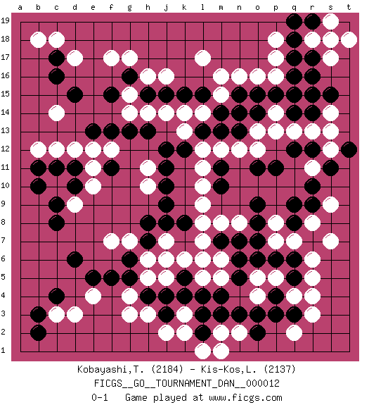 Last move : 0-1 2008 September 15 17:1:59 [Event "FICGS__GO__TOURNAMENT_DAN__000012"] [Site "FICGS"] [Date "2008.05.04"] [Round "1"] [Black "Kobayashi,Tetsuya"] [White "Kis-Kos,Laszlo"] [Result "0-1"] [Rating 1 "2184"] [Rating 2 "2137"] 1.r16 d17 2.q3 p17 3.c4 r5 4.r9 o4 5.q5 q4 6.p4 r4 7.p3 p5 8.q6 r3 9.o3 o5 10.m3 s7 11.q8 m5 12.k4 n8 13.q14 l17 14.d15 d12 15.f15 f17 16.d10 h16 17.c17 c18 18.c16 b18 19.h15 j16 20.f11 e4 21.d6 c3 22.b3 d3 23.b2 h3 24.f5 k2 25.l2 k3 26.l4 k6 27.q17 p16 28.o9 c10 29.c9 d9 30.c8 e10 31.d11 e11 32.c11 c12 33.b11 b12 34.b10 f12 35.e13 e12 36.h13 h11 37.o14 n2 38.n3 m2 39.l3 l1 40.o2 m1 41.h4 g4 42.j3 j2 43.j4 g3 44.g5 h5 45.j6 h6 46.h7 j5 47.k5 j7 48.g6 j6 49.l6 l5 50.n6 m6 51.n5 p7 52.p6 q7 53.o6 q2 54.m7 l7 55.m4 l6 56.r7 r6 57.o7 p8 58.o8 r8 59.q9 k14 60.g16 g17 61.j12 s9 62.j11 g14 63.g13 g15 64.f13 c14 65.j9 l9 66.j8 g7 67.h8 m8 68.n7 f7 69.e5 h10 70.j10 l11 71.k8 l8 72.m10 l10 73.l13 n12 74.m11 m12 75.o11 l12 76.m14 k13 77.k12 n14 78.n15 l14 79.m13 m15 80.n13 o13 81.n14 o12 82.p11 q13 83.r14 r11 84.q12 p14 85.p15 p13 86.q16 n16 87.o15 r13 88.r12 q15 89.r15 o16 90.q15 s12 91.s11 s14 92.t12 s13 93.r10 r18 94.q18 s17 95.s15 p18 96.r19 s19 97.q19 t18 98.r17 s18 99.l15 m16 100.k15 j14 101.j15 h14 0-1 Here are the names of the openings (joseki) played in the four corners : Corner q16 : r16 p17 Komoku (Somok, Xiao~mu`) 3-4 Point. The komoku (3-4) point is the traditional corner enclosure move.. Ikken Kakari (Hankan Keolch'im, Yi Gua`jiao~, 1-Space Low Pincer). The small knight move is the basic approach move to the 3-4 point stone. It has been continually used for over four centuries. There are limitless variations, with new moves constantly being discovered. White 2 opens the door to a treaure store of joseki. Corner q4 : q3 r5 Komoku (Somok, Xiao~mu`) 3-4 Point. The komoku (3-4) point is the traditional corner enclosure move.. Ikken Kakari (Hankan Keolch'im, Yi Gua`jiao~, 1-Space Low Pincer). The small knight move is the basic approach move to the 3-4 point stone. It has been continually used for over four centuries. There are limitless variations, with new moves constantly being discovered. White 2 opens the door to a treaure store of joseki. Corner d16 : d17 d15 Komoku (Somok, Xiao~mu`) 3-4 Point. The komoku (3-4) point is the traditional corner enclosure move.. Ikken Takagakari (Hankan Nop'dakeolch'im, Yi Gaogua`jiao~, 1-Space High Approach). The 5-4 approach move has become more popular in modern times, as modern Go emphasizes speed and influence. Corner d4 : c4 e4 Komoku (Somok, Xiao~mu`) 3-4 Point. The komoku (3-4) point is the traditional corner enclosure move.. Ikken Takagakari (Hankan Nop'dakeolch'im, Yi Gaogua`jiao~, 1-Space High Approach). The 5-4 approach move has become more popular in modern times, as modern Go emphasizes speed and influence. Player White won this Go (weiqi, baduk) game. Follow this game move after move (download)While the Baroque rules of chess could only have been created by humans, the rules of go are so elegant, organic, and rigorously logical that if intelligent life forms exist elsewhere in the universe, they almost certainly play go. (Edward Lasker, international chess master) I find your interest interesting. (Gregory House, House M.D.)