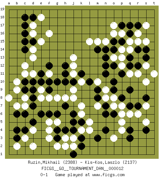 Last move : 0-1 2008 October 3 11:51:39 [Event "FICGS__GO__TOURNAMENT_DAN__000012"] [Site "FICGS"] [Date "2008.05.04"] [Round "1"] [Black "Ruzin,Mikhail"] [White "Kis-Kos,Laszlo"] [Result "0-1"] [Rating 1 "2388"] [Rating 2 "2137"] 1.q16 d4 2.q3 d16 3.q9 k4 4.c6 c8 5.e6 f4 6.b4 c3 7.c10 e8 8.c14 c12 9.e10 d14 10.d15 e15 11.c15 d13 12.c16 d17 13.c17 f16 14.d18 e18 15.c18 o17 16.g6 g8 17.g10 j8 18.j6 k6 19.h4 h3 20.j4 j3 21.k5 l5 22.j5 k7 23.k3 l4 24.g3 g2 25.g4 f3 26.k2 j2 27.j1 h2 28.m3 f5 29.f6 g5 30.h7 h8 31.b3 b2 32.c4 d2 33.b8 d6 34.d7 c7 35.d5 b7 36.d8 b9 37.c9 b10 38.b6 a8 39.o15 e9 40.d9 d11 41.f9 f8 42.d10 f11 43.f10 j11 44.j10 k10 45.h11 j12 46.h12 j13 47.e11 c11 48.f12 q14 49.q12 p16 50.p15 q15 51.p17 o16 52.q17 n15 53.o14 p13 54.n14 m15 55.m14 l15 56.n11 p12 57.o12 q11 58.r12 o13 59.n13 o11 60.n12 r11 61.s14 s15 62.s11 s10 63.s13 r16 64.r17 s17 65.r14 r15 66.q13 p14 67.o10 t11 68.p11 s12 69.k11 j9 70.h10 o3 71.n4 q6 72.r7 r6 73.q7 p4 74.q4 p5 75.n6 p7 76.o6 p6 77.p8 o7 78.n7 o8 79.o9 n8 80.m8 n9 81.s4 s7 82.s8 s5 83.m9 m10 84.l10 m7 0-1 Here are the names of the openings (joseki) played in the four corners : Corner d4 : d4 c6 Hoshi (Hwajeom, Seongjeom, Xingwei`) 4-4 Point. The star or hoshi (4-4) point, emphasizing influence at the potential expense of territory. Ikken Kakari (Hankan Keolch'im, Yi Gua`jiao~, 1-Space Low Approach). Black 2 is the standard approach move to the 4-4. Corner d16 : d16 c14 Hoshi (Hwajeom, Seongjeom, Xingwei`) 4-4 Point. The star or hoshi (4-4) point, emphasizing influence at the potential expense of territory. Ikken Kakari (Hankan Keolch'im, Yi Gua`jiao~, 1-Space Low Approach). Black 2 is the standard approach move to the 4-4. Corner q16 : q16 o17 Hoshi (Hwajeom, Seongjeom, Xingwei`) 4-4 Point. The star or hoshi (4-4) point, emphasizing influence at the potential expense of territory. Ikken Kakari (Hankan Keolch'im, Yi Gua`jiao~, 1-Space Low Approach). White 2 is the standard approach move to the 4-4. Player White won this Go (weiqi, baduk) game. Follow this game move after move (download)The strong player plays straight, the weak diagonally. (Anonymous) Luck is when opportunity knocks and you answer. (Anonymous)