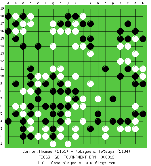 Last move : 1-0 2008 September 27 15:37:17 [Event "FICGS__GO__TOURNAMENT_DAN__000012"] [Site "FICGS"] [Date "2008.05.04"] [Round "1"] [Black "Connor,Thomas"] [White "Kobayashi,Tetsuya"] [Result "1-0"] [Rating 1 "2151"] [Rating 2 "2184"] 1.q16 d17 2.q4 d4 3.q10 o3 4.m3 r3 5.r4 q3 6.p4 o2 7.n5 r12 8.r11 q12 9.o11 r16 10.r15 s15 11.q15 r14 12.s16 s13 13.r17 s11 14.s10 t10 15.t9 t11 16.s9 k17 17.c14 c16 18.d10 c8 19.e14 j4 20.m17 g16 21.c3 d3 22.c4 c5 23.b5 b6 24.d5 c6 25.d2 e2 26.c2 f3 27.a4 e9 28.j6 k6 29.k7 l6 30.h8 l7 31.k8 l4 32.n4 n7 33.p7 e10 34.d11 m9 35.g6 e5 36.h17 h16 37.j17 j16 38.k18 l18 39.l17 k16 40.j18 g17 41.h4 j5 42.h5 h3 43.j3 k3 44.j2 k2 45.g3 h2 46.t15 q14 47.b9 j7 48.h6 j9 49.j8 k10 50.g10 g9 51.h9 h10 52.f9 g11 53.g8 f10 54.e8 d8 55.e7 g9 56.g2 j1 57.g10 h11 58.f6 g14 59.m15 l14 60.m14 m13 61.l15 k14 62.b15 s4 63.s5 s3 64.b17 b16 65.a16 b18 66.c18 c17 67.a18 a17 68.d6 g4 69.f4 g1 70.b17 s6 71.t5 a17 72.g5 f2 73.b17 d18 74.d9 1-0 Here are the names of the openings (joseki) played in the four corners : Corner q4 : q4 o3 Hoshi (Hwajeom, Seongjeom, Xingwei`) 4-4 Point. The star or hoshi (4-4) point, emphasizing influence at the potential expense of territory. Ikken Kakari (Hankan Keolch'im, Yi Gua`jiao~, 1-Space Low Approach). White 2 is the standard approach move to the 4-4. Corner q16 : q16 r12 Hoshi (Hwajeom, Seongjeom, Xingwei`) 4-4 Point. The star or hoshi (4-4) point, emphasizing influence at the potential expense of territory. Corner d16 : d17 c14 Komoku (Somok, Xiao~mu`) 3-4 Point. The komoku (3-4) point is the traditional corner enclosure move.. Nikken Kakari (Dukan Keolch'im, E`r Gua`jiao~, 2-Space Low Approach). Black 2 is used with friendly forces backing it up. Its purpose is to prevent a pincer. Locally it results in a loss, but may be appropriate fuseki strategy. It was popular in the late 1950s and early 1960s, but is not seen often nowadays, having been replaced by the one-space high approach, with which it has points in common. Player Black won this Go (weiqi, baduk) game. Follow this game move after move (download)Go is essentially a form of harmony. Go in the 21st century will have to be go of the 'harmony of the six points - the four quarters, the above and the below.' As in life we will need to view the whole rather than the part. Japanese go has focused too heavily on the local (joseki) rather than the whole for 300 years. The reason the Chinese and Koreans are overtaking the Japanese is that they are closer to achieve this whole-board view. (Go Seigen, 9p, 1994) Ah, beer! The cause of, and the solution to, all of life's problems. (Homer Simpson)