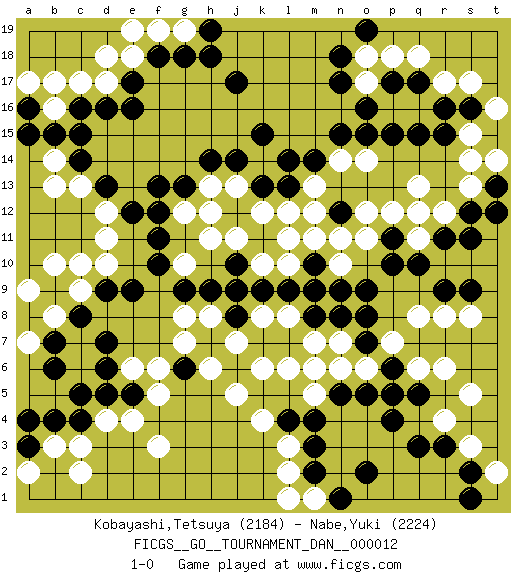 Last move : 1-0 2008 October 19 0:17:26 [Event "FICGS__GO__TOURNAMENT_DAN__000012"] [Site "FICGS"] [Date "2008.05.04"] [Round "1"] [Black "Kobayashi,Tetsuya"] [White "Nabe,Yuki"] [Result "1-0"] [Rating 1 "2184"] [Rating 2 "2224"] 1.r16 d4 2.c16 r4 3.j17 q13 4.q10 p16 5.p15 q16 6.q15 r17 7.r15 s17 8.o16 o17 9.n17 o18 10.n18 d10 11.n15 k4 12.p4 q6 13.r3 s3 14.q3 s5 15.m3 l3 16.m4 f3 17.c4 c3 18.c5 b3 19.d5 e4 20.c8 c13 21.e16 b10 22.b9 c9 23.d9 c10 24.e9 b8 25.b7 a9 26.d7 o14 27.o15 o11 28.o9 m11 29.n12 n11 30.l13 m9 31.n8 q11 32.p11 p12 33.p10 o12 34.r11 q12 35.l7 m13 36.m14 m12 37.p17 p18 38.q17 q18 39.f13 d17 40.d16 c17 41.e17 b16 42.b15 b17 43.c14 e18 44.f18 d18 45.k11 s14 46.f11 h11 47.j10 g10 48.f10 g8 49.g6 j9 50.k9 j7 51.j6 k6 52.k7 h6 53.h7 j5 54.j8 h8 55.j6 g12 56.f12 j7 57.q5 r6 58.j6 l12 59.k13 j7 60.h9 g7 61.g9 k12 62.j12 j13 63.k15 j11 64.j14 h13 65.h14 f19 66.g18 l2 67.m2 m1 68.n1 l1 69.o2 f6 70.e5 f5 71.p6 p7 72.o7 o6 73.p5 q8 74.r9 s8 75.d13 b13 76.s2 t2 77.s1 s15 78.s16 t16 79.b4 m7 80.m8 n7 81.o8 m5 82.n5 m6 83.o5 n6 84.l4 l6 85.a3 a2 86.a4 c2 87.s9 r8 88.g13 h12 89.a16 a17 90.a15 d12 91.e12 d11 92.o19 g19 93.h19 e19 94.h18 b14 95.c15 e6 96.d6 l8 97.l9 k8 98.m10 l10 99.n9 n10 100.m9 l11 101.s12 s13 102.t13 t14 103.t12 k10 104.j9 r12 105.s11 n14 106.l14 a7 107.b6 1-0 Here are the names of the openings (joseki) played in the four corners : Corner q16 : r16 q13 Komoku (Somok, Xiao~mu`) 3-4 Point. The komoku (3-4) point is the traditional corner enclosure move.. Corner q4 : r4 p4 Komoku (Somok, Xiao~mu`) 3-4 Point. The komoku (3-4) point is the traditional corner enclosure move.. Ikken Takagakari (Hankan Nop'dakeolch'im, Yi Gaogua`jiao~, 1-Space High Approach). The 5-4 approach move has become more popular in modern times, as modern Go emphasizes speed and influence. Player Black won this Go (weiqi, baduk) game. Follow this game move after move (download)The intersection is rarely neutral. (Pierre Audouard) The bottom line is always the bottom line. (Johann Piek)