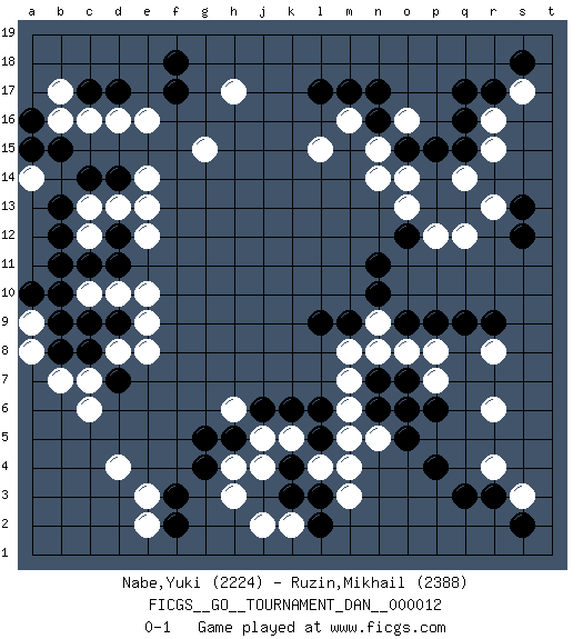 Last move : 0-1 2008 May 15 11:9:47 [Event "FICGS__GO__TOURNAMENT_DAN__000012"] [Site "FICGS"] [Date "2008.05.04"] [Round "1"] [Black "Nabe,Yuki"] [White "Ruzin,Mikhail"] [Result "0-1"] [Rating 1 "2224"] [Rating 2 "2388"] 1.q15 d4 2.p4 d16 3.f3 c6 4.k4 d10 5.f17 h17 6.c17 c16 7.d17 e16 8.f18 g15 9.q9 r4 10.r3 s3 11.q3 r6 12.s2 r8 13.r9 p7 14.r17 q12 15.s12 r13 16.s13 r15 17.q16 q14 18.l17 l15 19.n16 m16 20.m17 n15 21.o15 o16 22.n17 s17 23.s18 r16 24.q17 o14 25.p15 n14 26.o9 p8 27.p9 m7 28.o12 p12 29.n11 o13 30.m9 m4 31.k3 e2 32.f2 e3 33.n6 m6 34.n7 n5 35.o5 o6 36.p6 n8 37.o7 o8 38.o6 n9 39.n10 m8 40.l9 h3 41.g4 h4 42.h5 j5 43.g5 j4 44.l5 m5 45.j6 k5 46.k6 l4 47.l6 k2 48.l3 m3 49.l2 j2 50.c8 d8 51.d7 c7 52.d9 e8 53.c9 e9 54.b11 c10 55.b10 b7 56.d12 c13 57.b13 c12 58.c14 d13 59.d14 e14 60.b15 b16 61.c11 e12 62.d11 e10 63.b12 e13 64.b8 a8 65.b9 a9 66.a16 b17 67.a10 a14 68.a15 h6 0-1 Here are the names of the openings (joseki) played in the four corners : Corner d4 : d4 f3 Hoshi (Hwajeom, Seongjeom, Xingwei`) 4-4 Point. The star or hoshi (4-4) point, emphasizing influence at the potential expense of territory. Ikken Kakari (Hankan Keolch'im, Yi Gua`jiao~, 1-Space Low Approach). Black 2 is the standard approach move to the 4-4. Corner d16 : d16 f17 Hoshi (Hwajeom, Seongjeom, Xingwei`) 4-4 Point. The star or hoshi (4-4) point, emphasizing influence at the potential expense of territory. Ikken Kakari (Hankan Keolch'im, Yi Gua`jiao~, 1-Space Low Approach). Black 2 is the standard approach move to the 4-4. Player White won this Go (weiqi, baduk) game. Follow this game move after move (download)A meijin needs no joseki. (Anonymous) It is not enough to be a good player... you must also play well. (Siegbert Tarrasch)