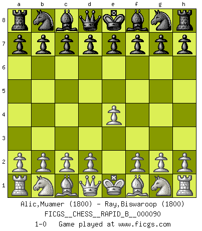 Last move : 1-0 2008 June 4 23:38:54 [Event "FICGS__CHESS__RAPID_B__000090"] [Site "FICGS"] [Date "2008.05.05"] [Round "1"] [White "Alic,Muamer"] [Black "Ray,Biswaroop"] [Result "1-0"] [WhiteElo "1800"] [BlackElo "1800"] 1.e4 1-0 This chess game has been lost on time (started : 2008.05.05 0:51:2) King's pawn Opening Player White won this chess game. Follow this game move after move (download)When you play Bobby, it is not a question if you win or lose. It is a question if you survive. (Boris Spassky) Der Freibauer hat für mich eine Seele, genau wie der Mensch, Wünsche, die unerkannt in ihm schlummern, und Befürchtungen, von deren Existenz er selbst kaum ahnt. (Aaron Nimzowitsch) Es el objetivo de la escuela moderna no tratar cada posición de acuerdo a una regla general, sino de acuerdo al principio inherente en la posición. (Richard Reti) Il (Jacob Murray) ne joue pas pour le bon coup, mais pour le meilleur. (Eloi Relange) It is not titles that honor men, but men that honor titles. (Niccolo Machiavelli)
