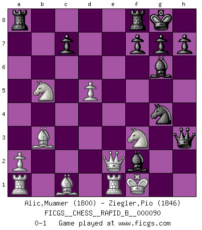 Last move : 0-1 2008 July 7 14:35:31 [Event "FICGS__CHESS__RAPID_B__000090"] [Site "FICGS"] [Date "2008.05.05"] [Round "1"] [White "Alic,Muamer"] [Black "Ziegler,Pio"] [Result "0-1"] [WhiteElo "1800"] [BlackElo "1846"] 1.e4 e5 2.Nf3 Nc6 3.Bb5 a6 4.Ba4 Nf6 5.O-O Be7 6.Re1 b5 7.Bb3 d6 8.c3 O-O 9.d4 Bg4 10.Nbd2 exd4 11.h3 Bh5 12.g4 dxc3 13.bxc3 Bg6 14.c4 Ne5 15.cxb5 axb5 16.Nd4 d5 17.exd5 Bc5 18.Nxb5 Nfxg4 19.hxg4 Qh4 20.Qe2 Nxg4 21.Nf3 Bxf2+ 22.Kf1 Qh3+ 0-1 This chess game has been lost on time (started : 2008.05.05 0:51:2) Comment by player 2 : Pio Ziegler : Thanks for the game, Muamer. Ruy Lopez : Closed Kingside Castling by player White (move 5) Kingside Castling by player Black (move 8) Player Black won this chess game. Follow this game move after move (download)No Chess Grandmaster is normal; they only differ in the extent of their madness. (Viktor Korchnoi) Dieses schreckliche Gefühl, dass ich gegen eine Maschine spielte, die niemals Fehler macht, zerschmetterte meinen Widerstand. (Mark Taimanov) Solo los afeminados hacen el Enroque. (Rob Sillars) On croit qu'il y a plus de mauvais joueurs que de bons joueurs, c'est faux : Il y a autant de joueurs qui gagnent que de joueurs qui perdent. (Philippe Geluck) The good fighters of old first put themselves beyond the possibility of defeat, and then waited for an opportunity of defeating the enemy. (Sun Tzu)