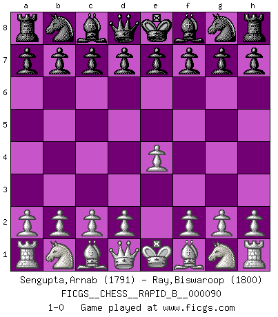 Last move : 1-0 2008 June 4 11:35:28 [Event "FICGS__CHESS__RAPID_B__000090"] [Site "FICGS"] [Date "2008.05.05"] [Round "1"] [White "Sengupta,Arnab"] [Black "Ray,Biswaroop"] [Result "1-0"] [WhiteElo "1791"] [BlackElo "1800"] 1.e4 1-0 This chess game has been lost on time (started : 2008.05.05 0:51:2) King's pawn Opening Player White won this chess game. Follow this game move after move (download)Chess mastery essentially consists of analyzing Chess positions accurately. (Mikhail Botvinnik) Ich habe die besten Aussichten, den ersten Preis zu gewinnen - denn jeder muss gegen Steinitz spielen, nur ich nicht! (Wilhelm Steinitz) Yo creo que el Ajedrez posee una magia que es también una ayuda en la edad avanzada. Una rodilla reumática es olvidada durante una partida de Ajedrez y otros eventos pueden parecer algo sin importancia comparada a una catástrofe en el tablero de Ajedrez. (Vlastimil Hort) L'attaque fait le spectacle, la défense gagne les matchs. (Dicton footballistique) There is a very easy way to return from a casino with a small fortune : go there with a large one. (Jack Yelton)