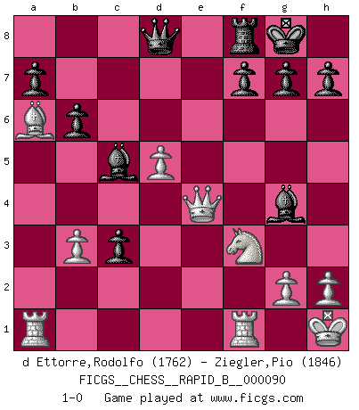 Last move : 1-0 2008 June 1 12:15:10 [Event "FICGS__CHESS__RAPID_B__000090"] [Site "FICGS"] [Date "2008.05.05"] [Round "1"] [White "d Ettorre,Rodolfo"] [Black "Ziegler,Pio"] [Result "1-0"] [WhiteElo "1762"] [BlackElo "1846"] 1.Nf3 d5 2.c4 d4 3.b4 c5 4.e3 dxe3 5.fxe3 cxb4 6.d4 Nf6 7.Bd3 Nc6 8.Bb2 e6 9.e4 Be7 10.d5 exd5 11.cxd5 Na5 12.Bd4 O-O 13.O-O Bg4 14.Nbd2 Rc8 15.Qb1 b6 16.Ba6 Rc3 17.Kh1 Bc5 18.Bxc3 bxc3 19.Nb3 Nxb3 20.axb3 Nxe4 21.Qxe4 1-0 Reti : Advance variation Kingside Castling by player Black (move 12) Kingside Castling by player White (move 13) Player White won this chess game. Follow this game move after move (download)A man without frontiers. He didn't divide the East and the West, he brought them together in their admiration for him. (Ljubomir Ljubojevic, about Bobby Fischer's death) Ich organisiere ein großes Turnier, was mich etwa 120000 Dollar kostet. Ich denke, das ist das erste Mal in der Schachgeschichte, daß ein Schachgroßmeister auch als Mäzen auftritt. (Miguel Najdorf) Una compensación adecuada por un sacrificio es tener una combinación sólida que conduce a una posición ganadora; una compensación adecuada por una metida de pata es dejar a tu oponente arrebatar una derrota de las fauces de la victoria. (Bruce A. Moon) J'ai toujours senti une vague pitié pour l'homme qui ne connaît rien aux échecs, tout comme j'en aurais pour un homme ignorant de l'amour. Les Echecs, comme la musique ou comme l'amour, ont le pouvoir de rendre heureux. (Siegbert Tarrasch) As the days dwindle down... to a precious few. (Maxwell Anderson)
