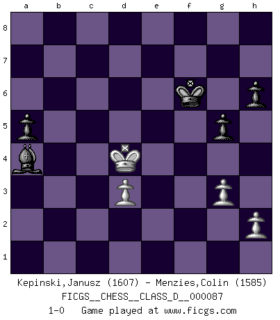 Last move : 1-0 2008 December 2 22:40:14 [Event "FICGS__CHESS__CLASS_D__000087"] [Site "FICGS"] [Date "2008.05.06"] [Round "1"] [White "Kepinski,Janusz"] [Black "Menzies,Colin"] [Result "1-0"] [WhiteElo "1607"] [BlackElo "1585"] 1.Nf3 Nc6 2.c4 e5 3.g3 f5 4.d3 Bc5 5.Bg2 Nf6 6.a3 e4 7.dxe4 fxe4 8.Ng5 O-O 9.Nc3 e3 10.Bxe3 Bxe3 11.fxe3 d6 12.O-O Ne5 13.Qd4 h6 14.Nf3 c5 15.Qd1 Nxc4 16.Qb3 d5 17.e4 Ne3 18.Rfe1 c4 19.Qa4 Nxe4 20.Nxe4 dxe4 21.Ne5 Qf6 22.Rf1 Nxf1 23.Qxc4+ Be6 24.Rxf1 Qxe5 25.Qxe4 Rxf1+ 26.Kxf1 Rf8+ 27.Ke1 Qxe4 28.Bxe4 b6 29.Bd3 g5 30.b4 Rd8 31.Kf2 Kf7 32.Ke3 Kf6 33.a4 a5 34.bxa5 bxa5 35.Kf3 Rxd3+ 36.exd3 Bb3 37.Ke3 Bxa4 38.Kd4 1-0 Reti Opening Kingside Castling by player Black (move 8) Kingside Castling by player White (move 12) 10 pieces endgame at move 36 : White KPPPP , Black KBPPP WHITE : King + 4 Pawns BLACK : King + 1 Bishop 3 Pawns 9 pieces endgame at move 37 : White KPPP , Black KBPPP WHITE : King + 3 Pawns BLACK : King + 1 Bishop 3 Pawns Player White won this chess game. Follow this game move after move (download)Only sissies Castle. (Rob Sillars) Die Neutralität betrachte ich als eine schwere Krankheit. (Viktor Kortschnoi) La única cosa que los jugadores de Ajedrez tienen en común, es el Ajedrez. (Lodewijk Prins) Il n'y a plus de joueurs du niveau de Jacob Murray dont la seule quête est le beau jeu, le plaisir de voir les pièces construire quelque chose. Sur 10 idées à la minute, 9 seront sans intérêt, la dernière s'avèrera géniale. (Christian Bauer) Never was anything great achieved without danger. (Niccolo Machiavelli)