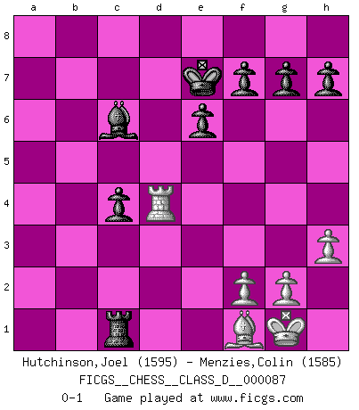Last move : 0-1 2008 October 1 22:37:48 [Event "FICGS__CHESS__CLASS_D__000087"] [Site "FICGS"] [Date "2008.05.06"] [Round "1"] [White "Hutchinson,Joel"] [Black "Menzies,Colin"] [Result "0-1"] [WhiteElo "1595"] [BlackElo "1585"] 1.e4 c5 2.Nf3 Nc6 3.d4 cxd4 4.Nxd4 e6 5.c4 Qh4 6.Nc3 Bb4 7.Qd3 Nf6 8.Bd2 Bxc3 9.Bxc3 Qxe4+ 10.Qxe4 Nxe4 11.Nxc6 Nxc3 12.Nxa7 Rxa7 13.bxc3 d6 14.Be2 Bd7 15.O-O Ke7 16.Rfd1 Rha8 17.Rd2 Bc6 18.Bd1 Ra3 19.Rc2 R8a5 20.Be2 Be4 21.Rd2 Rxc3 22.Rad1 R5a3 23.Rxd6 Rxa2 24.R6d2 Rxd2 25.Rxd2 Rc1+ 26.Bf1 Bc6 27.h3 b5 28.Rd4 bxc4 0-1 This chess game has been lost on time (started : 2008.05.06 4:5:5) Sicilian defense Kingside Castling by player White (move 15) Player Black won this chess game. Follow this game move after move (download)No price is too great for the scalp of the enemy King. (Koblentz) Der Partner hat auch seine Existenzberechtigung. (Savielly Grigorievitsch Tartakower) Mi estilo es algo parecido entre un poco de Tal y Petrosian. (Reshevsky) Je menace de comprendre la position. (Anonyme) I can't decide which is riskier; taking crazy risks, or taking advice on crazy risks from a crazy risk taker. (Gregory House in House M.D.)