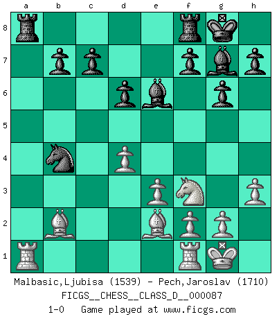 Last move : 1-0 2008 August 22 19:4:16 [Event "FICGS__CHESS__CLASS_D__000087"] [Site "FICGS"] [Date "2008.05.06"] [Round "1"] [White "Malbasic,Ljubisa"] [Black "Pech,Jaroslav"] [Result "1-0"] [WhiteElo "1539"] [BlackElo "1710"] 1.d4 Nf6 2.Nf3 g6 3.e3 Bg7 4.Nbd2 d5 5.c4 O-O 6.Be2 Nc6 7.a3 Bf5 8.O-O Qd6 9.b4 dxc4 10.Nxc4 Qd5 11.Bb2 a5 12.Nce5 axb4 13.Nxc6 Qxc6 14.axb4 Qd6 15.Qb3 Be6 16.Qc3 Nd5 17.Qc5 Nxb4 18.Qxd6 exd6 19.h3 1-0 This chess game has been lost on time (started : 2008.05.06 4:5:5) King's Indian : East Indian defense Kingside Castling by player Black (move 5) Kingside Castling by player White (move 8) Player White won this chess game. Follow this game move after move (download)A bad day of Chess is better than any good day at work. (Anonymous) Jeder Fehler erscheint unglaublich dumm, wenn andre ihn begehen. (Georg Christoph Lichtenberg) El Ajedrez es el arte del análisis. (Mikhail Botvinnik) Les échecs sont utiles à l'exercice de la faculté de penser et à celle de l'imagination. Car nous devons posséder une méthode élaborée pour atteindre des buts partout où nous devons conduire notre raison. (Leibnitz) I've lost money so fast in these clubs it's left me reeling. I've read every poker book ever written, but the only way to get better at the game is to go out and play with people who are really good. The problem is, you stand to lose a lot of money doing it. (Matt Damon)