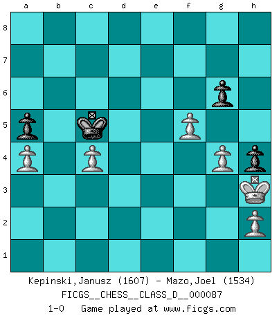 Last move : 1-0 2008 August 11 10:24:53 [Event "FICGS__CHESS__CLASS_D__000087"] [Site "FICGS"] [Date "2008.05.06"] [Round "1"] [White "Kepinski,Janusz"] [Black "Mazo,Joel"] [Result "1-0"] [WhiteElo "1607"] [BlackElo "1534"] 1.Nf3 e6 2.g3 d6 3.d4 c6 4.e4 f6 5.Be2 b6 6.O-O a6 7.c4 g6 8.Nc3 Ne7 9.e5 Bg7 10.Ne4 fxe5 11.dxe5 dxe5 12.Qxd8+ Kxd8 13.Nd6 Kc7 14.Nf7 Rf8 15.N7xe5 Nd7 16.Bf4 Nxe5 17.Bxe5+ Bxe5 18.Nxe5 Bb7 19.Rad1 Rad8 20.b4 h5 21.a4 c5 22.bxc5 bxc5 23.f4 Be4 24.Bd3 Bxd3 25.Nxd3 Kc6 26.Rfe1 h4 27.Rxe6+ Kd7 28.Nxc5+ Ke8 29.Rde1 Rf7 30.Nb7 Rd7 31.Nd6+ Kf8 32.Nxf7 Kxf7 33.Rxe7+ Rxe7 34.Rxe7+ Kxe7 35.g4 Kd6 36.Kg2 a5 37.Kh3 Kc5 38.f5 1-0 Reti Opening Kingside Castling by player White (move 6) 10 pieces endgame at move 34 : White KPPPPP , Black KPPP WHITE : King + 5 Pawns BLACK : King + 3 Pawns Player White won this chess game. Follow this game move after move (download)If Chess is a science, it's a most inexact one. If Chess is an art, it is too exacting to be seen as one. If Chess is a sport, it's too esoteric. If Chess is a game, it's too demanding to be just a game. If Chess is a mistress, she's a demanding one. If Chess is a passion, it's a rewarding one. If Chess is life, it's a sad one. (Unknown) Es gibt zwei Arten von Opfern: Korrekte und meine. (Mikhail Nekhemyevich Tal) Sin errores no puede haber brillantez. (Emanuel Lasker) Les réformistes prétendent que les progrès de la théorie conduiront à la disparition des échecs, et qu'il faut, pour leur rendre vie, en remanier les règles. En réalité, qu'exprime cette affirmation? Le mépris de l'intuition, de l'imagination et de tous les autres éléments qui font des échecs un art. (Alexander Alekhine) The worth of a book is to be measured by what you can carry away from it. (James Bryce)