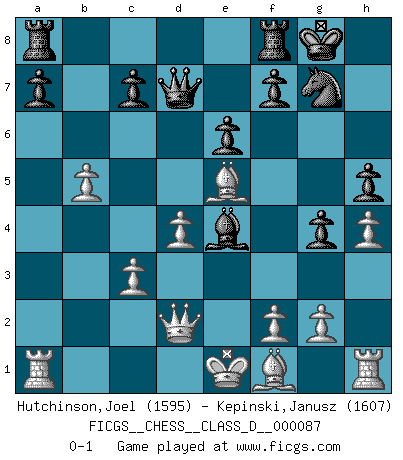 Last move : 0-1 2008 October 6 22:50:32 [Event "FICGS__CHESS__CLASS_D__000087"] [Site "FICGS"] [Date "2008.05.06"] [Round "1"] [White "Hutchinson,Joel"] [Black "Kepinski,Janusz"] [Result "0-1"] [WhiteElo "1595"] [BlackElo "1607"] 1.d4 d5 2.c4 Nc6 3.Nc3 Nf6 4.Nf3 e6 5.Bg5 Bb4 6.a3 Bxc3+ 7.bxc3 dxc4 8.e3 h6 9.Bh4 g5 10.Bg3 b5 11.a4 Ba6 12.Nd2 Nd5 13.Ne4 h5 14.h4 g4 15.Nc5 Qc8 16.Qc1 Bb7 17.axb5 Nce7 18.Bxc4 Nb6 19.Bf1 Nd7 20.Nxd7 Qxd7 21.Qc2 Nf5 22.Be5 O-O 23.e4 Ng7 24.Qd2 Bxe4 0-1 This chess game has been lost on time (started : 2008.05.06 4:5:5) QGD : Chigorin defense Kingside Castling by player Black (move 22) Player Black won this chess game. Follow this game move after move (download)The blunders are all there on the board, waiting to be made. (Savielly Tartakover) Der zweitbeste Zug ist oft der einzig richtige. (Savielly Grigorievitsch Tartakower) La estratégia requiere pensar, la táctica requiere observación. (Max Euwe) Le profane ne songe pas à la somme de jouissance dont il se prive, qui méconnaît ce jeu aux ressources aussi variées que passionnantes. (Jean-Marie Jeanton-Lamarche) He who is a good ruler must first have been ruled. (Aristotle)