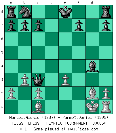 Last move : 0-1 2008 May 21 14:4:14 [Event "FICGS__CHESS__THEMATIC_TOURNAMENT__000050"] [Site "FICGS"] [Date "2008.05.07"] [Round "1"] [White "Marcel,Alexis"] [Black "Parmet,Daniel"] [Result "0-1"] [WhiteElo "1287"] [BlackElo "1595"] 1.f4 e5 2.fxe5 d6 3.exd6 Bxd6 4.Nf3 g5 5.g3 g4 6.Nh4 Ne7 7.Bg2 Ng6 8.b3 Nxh4 9.gxh4 Qxh4+ 10.Kf1 Qf6+ 11.Kg1 Qxa1 12.Nc3 Bc5+ 13.e3 Bxe3+ 14.dxe3 Qxc3 15.Qxg4 Bxg4 0-1 Bird : From gambit, Lasker variation Player Black won this chess game. Follow this game move after move (download)Pawns are born free, yet they are everywhere in chains. (Rick Kennedy) Kasparov ist eine Art Monster mit hundert Augen, denen auch nicht das Geringste entgeht. (Tony Miles) El poder defensivo de una pieza clavada, solamente es imaginario. (Aaron Nimzovich) Aucun coup ne doit être joué sans but. (Pedro Damiano) Quotation,n.: The act of repeating erroneously the words of another. The words erroneously repeated. (Ambrose Bierce, The Devil's Dictionary)