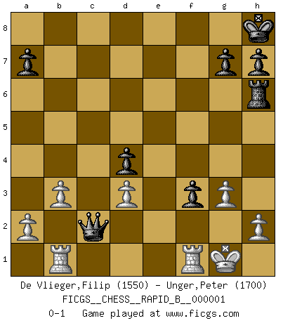 Last move : 0-1 2006 April 19 16:16:0 [Event "FICGS__CHESS__RAPID_B__000001"] [Site "FICGS"] [Date "2006.04.14"] [Round "1"] [White "De Vlieger,Filip"] [Black "Unger,Peter"] [Result "0-1"] [WhiteElo "1550"] [BlackElo "1700"] 1.e4 c5 2.Nf3 Nc6 3.d4 cxd4 4.Nxd4 Nf6 5.Nxc6 bxc6 6.e5 Qa5+ 7.Nc3 Qxe5+ 8.Be2 d5 9.O-O Qc7 10.Bg5 e5 11.Bh4 Be7 12.Bg3 O-O 13.Bf3 Rb8 14.Rb1 d4 15.Ne4 Nxe4 16.Bxe4 f5 17.Bxc6 f4 18.Bd5+ Kh8 19.Qh5 Rb6 20.Bxf4 Rxf4 21.Be4 Rh6 22.Qe8+ Rf8 23.Qa4 Bd7 24.Qb3 Rb6 25.Qd3 Bb5 26.Qh3 Rh6 27.Qb3 Bc4 28.Qg3 Rf4 29.Bd3 Bh4 30.Qxf4 exf4 31.b3 Bxd3 32.cxd3 f3 33.g3 Bxg3 34.fxg3 Qc2 0-1 Sicilian defense Kingside Castling by player White (move 9) Kingside Castling by player Black (move 12) Player Black won this chess game. Follow this game move after move (download)If you aren't afraid of Spassky, then I have removed the element of money. (Jim Slater) Wenn ich gewinne bin ich ein Genie. Wenn nicht, dann bin ich keines. (Robert James Fischer) Hoy en día, si tu no eres un Gran Maestro a los 14 años, es mejor que lo olvides. (Anand Viswanathan) La vérité est comme le meilleur coup aux échecs : elle existe, mais il faut la chercher. (Arturo Perez-Reverte) If you know the enemy and know yourself you need not fear the results of a hundred battles. (Sun Tzu)