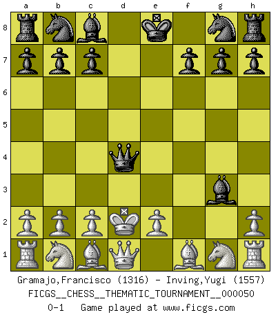 Last move : 0-1 2008 May 16 19:4:16 [Event "FICGS__CHESS__THEMATIC_TOURNAMENT__000050"] [Site "FICGS"] [Date "2008.05.07"] [Round "1"] [White "Gramajo,Francisco"] [Black "Inving,Yugi"] [Result "0-1"] [WhiteElo "1316"] [BlackElo "1557"] 1.f4 e5 2.fxe5 d6 3.exd6 Bxd6 4.d4 Qh4+ 5.g3 Bxg3+ 6.Kd2 Qxd4+ 0-1 Bird : From gambit Player Black won this chess game. Follow this game move after move (download)For me, Chess is life and every game is like a new life. Every Chess player gets to live many lives in one lifetime. (Eduard Gufeld) Wer mein Gambit spielt, muß bereit sein, alle Brücken hinter sich abzubrechen. Es verändert den ganzen Menschen. Es wirkt wie ein Zauberstab und fördert verkümmerte, gute Charakter- eigenschaften wieder zu Tage. (Emil Joseph Diemer) No solamente yo pronostico su triunfo sobre Botvinnik, sino que me adelanto y digo que probablemente Fischer es el jugador de Ajedrez mas grande que haya existido. (John Collins) Demandez au pauvre Cg1 ce qu'il en pense. Eduard Gufeld à propos de la variante Saemisch de l'Est-Indienne. Life is painting a picture, not doing a sum. (Oliver Wendell Holmes, Jr.)