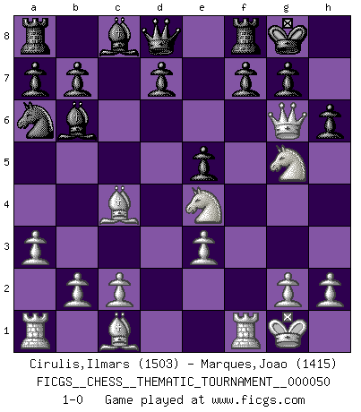 Last move : 1-0 2008 May 21 18:38:47 [Event "FICGS__CHESS__THEMATIC_TOURNAMENT__000050"] [Site "FICGS"] [Date "2008.05.07"] [Round "1"] [White "Cirulis,Ilmars"] [Black "Marques,Joao"] [Result "1-0"] [WhiteElo "1503"] [BlackElo "1415"] 1.f4 e5 2.fxe5 Nc6 3.Nf3 Bc5 4.e3 Nge7 5.d4 Bb6 6.Nc3 O-O 7.d5 Nb4 8.a3 Na6 9.d6 Ng6 10.Bc4 Re8 11.O-O Rf8 12.Ne4 cxd6 13.Nfg5 dxe5 14.Qh5 h6 15.Qxg6 1-0 Bird : From gambit Kingside Castling by player Black (move 6) Kingside Castling by player White (move 11) Player White won this chess game. Follow this game move after move (download)Chess is not like life... it has rules ! (Mark Pasternak) Weshalb minderdergeübte Spieler mit g2-g4 beginnen? Die betreffenden sind unschlüssig, ob sie nun rechts (h4) oder links (f4) beginnen sollen, und in ihrer Ratlosigkeit entschliessen sie sich nach guter Bürgerart dazu, den goldenen Mittelweg zu wählen. (Aaron Nimzowitsch) ¿Cual es el objetivo de jugar una apertura de gambito?... Para adquirir una reputación de ser un jugador apuesto a costo de perder el juego. (Siegbert Tarrasch) Le système Elo représente seulement une moyenne. Il est simplement un indicateur de votre stabilité. (Anatoli Karpov) The general who wins the battle makes many calculations in his temple before the battle is fought. The general who loses makes but few calculations beforehand. (Sun Tzu)