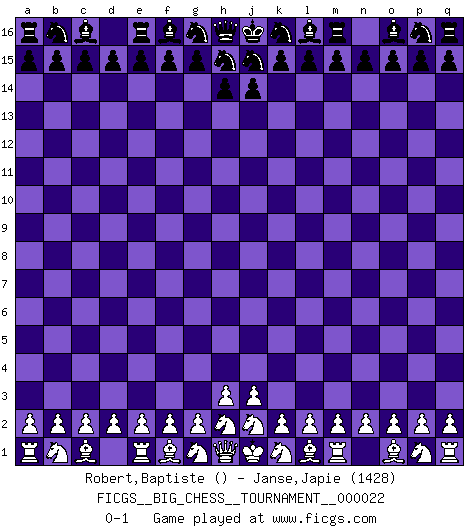 Last move : 0-1 2008 June 8 11:54:23 [Event "FICGS__BIG_CHESS__TOURNAMENT__000022"] [Site "FICGS"] [Date "2008.05.09"] [Round "1"] [White "Robert,Baptiste"] [Black "Janse,Japie"] [Result "0-1"] [WhiteElo ""] [BlackElo "1428"] 0-1 This big chess game has been lost on time (started : 2008.05.09 0:37:27) Follow this game move after move (download)Chess is a fairy tale of 1001 blunders. (Savielly Tartakower) Wie bekannt hörte Morphy 1859 auf, Schach zu spielen. Seine Enttäuschung galt nicht so sehr dem Schach, wie den Schachspielern. (Robert James Fischer) Debemos de asegurarnos de que el Ajedrez no se convierta en un lenguaje muerto, muy interesante, pero tan solo para un grupo muy pequeño. (Sytze Faber) Les erreurs sont comme les malheurs, elles n'arrivent jamais seules. (Siegbert Tarrasch) Computers have lots of memory but no imagination. (Anonymous)