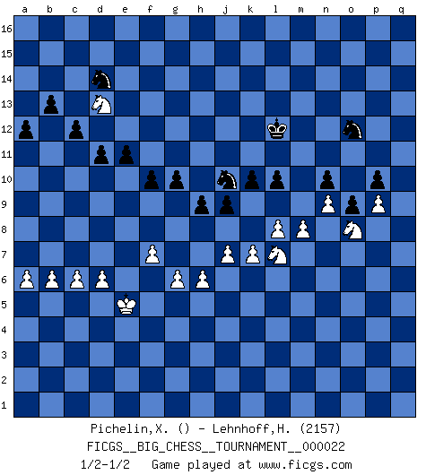 Last move : 1/2-1/2 2009 March 1 13:48:22 [Event "FICGS__BIG_CHESS__TOURNAMENT__000022"] [Site "FICGS"] [Date "2008.05.09"] [Round "1"] [White "Pichelin,Xavier"] [Black "Lehnhoff,Heinz-Georg"] [Result "1/2-1/2"] [WhiteElo ""] [BlackElo "2157"] 1.j2-h4 g15-g14 2.b1-c3 m15-m13 3.m2-m4 j15-k13 4.p1-o3 e15-e13 5.e2-e4 d15-d13 6.l1-o4 h16-o10 7.n2-n3 c15-c14 8.h1-l4 b16-a14 9.f1-b5 g16-j15 10.d2-d4 n15-n13 11.c1-e3 p16-q14 12.o3-n5 o16-j11 13.l4-j4 j11-g13 14.o2-o3 e13-e12 15.n5-l4 h15-j13 16.g1-j2 c16-g12 17.l4-j5 a14-c13 18.o4-k8 m13-m12 19.b5-f9 o15-o14 20.m1-m3 m16-m14 21.m3-k3 m14-l14 22.l2-l4 c13-d11 23.a1-d1 l16-p12 24.g2-g4 f16-b12 25.j5-h7 e16-e14 26.c3-d5 e14-f14 27.f9-e8 a15-a13 28.d5-f6 d11-f10 29.e8-g6 f10-h9 30.k8-g5 h9-f8 31.h7-f8 b12-f8 32.f6-h7 f8-b12 33.f2-f4 q14-o13 34.e1-e2 o13-n11 35.e3-f2 q15-q14 36.j2-k4 o10-o7 37.k4-m5 k16-h15 38.k1-l3 f14-f11 39.j4-j7 o7-j7 40.g5-j7 a16-e16 41.f4-f5 e16-e13 42.e2-e3 e13-f13 43.f2-g3 f11-c11 44.d1-d2 g13-l9 45.g3-f4 l9-j7 46.f4-j7 c11-c8 47.e3-a3 b15-b13 48.l4-l5 l14-l11 49.j7-g5 a13-a12 50.a3-b3 b12-d14 51.g5-k8 d14-k8 52.k3-k8 c8-k8 53.h7-k8 f13-f8 54.h4-j6 j15-g16 55.d2-d3 l11-c11 56.d3-c3 f8-c8 57.c3-c8 c11-c8 58.c2-c3 p12-n14 59.d4-d5 j16-j15 60.m5-n7 k13-l11 61.h2-j4 q16-m16 62.j1-h2 m16-m14 63.l5-l6 m14-k14 64.l6-l7 k14-k10 65.o1-l4 l11-k9 66.k8-m9 n11-m9 67.n7-m9 k10-m10 68.m9-n7 k9-j7 69.g6-h7 j7-g8 70.b3-b6 g8-j9 71.h7-g6 j9-k7 72.k2-k4 g16-e15 73.j6-l5 k7-l5 74.j4-l5 m10-p10 75.p2-p4 n14-h9 76.n3-n4 l15-l13 77.q2-q4 k15-k13 78.m4-m5 f15-f13 79.g6-h5 l13-l12 80.m5-m6 j13-k11 81.l4-n6 g12-f11 82.n6-m5 h9-m5 83.l3-m5 c8-a8 84.a2-a3 p10-o10 85.n7-o5 a8-a6 86.b6-b4 f11-e10 87.q1-l1 p15-p13 88.n4-n5 e10-f11 89.h5-k7 h15-g13 90.k7-f11 g13-f11 91.k4-k5 q14-q13 92.l5-m7 q13-q12 93.m5-n7 a6-a9 94.o5-m4 m12-m11 95.n7-m5 o14-o13 96.o3-o4 n13-n12 97.l1-l4 o10-h10 98.l4-j4 f11-g9 99.m7-k8 g9-f7 100.k8-j6 a9-e9 101.m5-k6 f7-e5 102.g4-g5 h10-c10 103.b4-b7 c10-c4 104.h2-g3 e5-d3 105.g3-f3 c4-e4 106.j4-e4 e9-e4 107.f3-e4 d3-c5 108.e4-e5 c5-b7 109.b2-b4 f13-f12 110.m4-l6 e15-f13 111.j6-h8 b7-d8 112.k6-j8 g14-g13 113.g5-g6 h14-h13 114.h8-j10 j15-k14 115.l6-m8 d8-f9 116.m8-o9 k14-l13 117.j8-k10 g13-g12 118.k10-m9 j14-j13 119.o9-n11 k11-m12 120.o4-o5 f9-g11 121.j10-h8 f13-h12 122.j3-j4 c14-c13 123.p4-p5 k13-k12 124.n5-n6 g11-j10 125.h8-k7 h12-k11 126.m9-k10 l12-l11 127.k10-j8 d13-d12 128.q4-q5 k11-m10 129.m6-m7 m10-l12 130.n11-o9 m12-n10 131.q5-q6 p13-p12 132.p5-p6 p12-p11 133.n6-n7 o13-o12 134.o5-o6 l12-j11 135.q6-q7 q12-q11 136.h3-h4 j11-k9 137.q7-q8 q11-q10 138.a3-a4 l13-l12 139.c3-c4 j13-j12 140.a4-a5 g12-g11 141.b4-b5 f12-f11 142.c4-c5 h13-h12 143.b5-b6 h12-h11 144.a5-a6 h11-h10 145.h4-h5 k12-k11 146.k5-k6 g11-g10 147.j4-j5 j12-j11 148.j5-j6 k11-k10 149.j6-j7 h10-h9 150.j8-h6 k9-h10 151.o6-o7 j10-l9 152.k7-l5 l9-j8 153.h6-j4 j8-g7 154.j4-g3 n10-l9 155.h5-h6 g7-j8 156.g3-j4 j11-j10 157.m7-m8 l9-k11 158.l5-j6 j10-j9 159.k6-k7 j8-g9 160.j4-k6 n12-n11 161.l7-l8 n11-n10 162.o9-p7 h10-g8 163.k6-j4 k11-m10 164.j6-l7 l11-l10 165.f5-f6 o12-o11 166.n7-n8 m10-n12 167.p7-n6 m11-m10 168.p6-p7 g9-j10 169.n6-l5 n12-l11 170.l5-m7 e12-e11 171.c5-c6 f11-f10 172.d5-d6 d12-d11 173.f6-f7 g8-h10 174.j4-g5 c13-c12 175.g5-e6 h10-k11 176.e6-f8 k11-h12 177.f8-d9 h12-f13 178.d9-c11 f13-d14 179.p7-p8 p11-p10 180.o7-o8 o11-o10 181.c11-d13 d14-f13 182.n8-n9 m10-n9 183.o8-n9 o10-o9 184.p8-p9 q10-p9 185.q8-p9 l11-m13 186.m7-o8 m13-o12 187.d13-f12 f13-h12 188.f12-d13 h12-f13 189.d13-c11 f13-d14 190.c11-d13 1/2-1/2 Follow this game move after move (download)My God, Bobby Fischer plays so simply. (Alexei Suetin) Smyslow ist ein Beweis dafür, dass ich noch zehn Jahre spielen kann! [der 75 jährige über den 85 jährigen] (Viktor Kortschnoi) Creo que una cierta cantidad de temperamento es esperada de los genios del Ajedrez. (Ron Gross) Le profane ne songe pas à la somme de jouissance dont il se prive, qui méconnaît ce jeu aux ressources aussi variées que passionnantes. (Jean-Marie Jeanton-Lamarche) Never was anything great achieved without danger. (Niccolo Machiavelli)