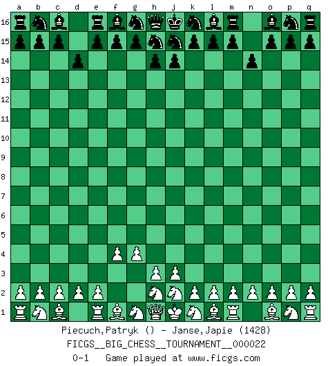 Last move : 0-1 2008 June 10 11:56:58 [Event "FICGS__BIG_CHESS__TOURNAMENT__000022"] [Site "FICGS"] [Date "2008.05.09"] [Round "1"] [White "Piecuch,Patryk"] [Black "Janse,Japie"] [Result "0-1"] [WhiteElo ""] [BlackElo "1428"] 1.g2-g4 n15-n14 2.f2-f4 d15-d14 0-1 This big chess game has been lost on time (started : 2008.05.09 0:37:27) Follow this game move after move (download)In Fischer's hands, a slight theoretical advantage is as good a being a Queen ahead. (Isaac Kashdan) Modernes Schach sorgt sich zuviel um Dinge wie Bauernstruktur usw. Vergessen Sie das, Schachmatt beendet das Spiel! (Nigel Short) Prefiero perder una partida realmente buena, que ganar una mala. (David Levy) Dans le domaine de la peinture, de la gravure et de la sculpture, dès la première décennie de notre siècle, les artistes abandonnent la représentation de la partie d'échecs pour se concentrer sur les pièces, sur les échiquiers et sur toutes les variations auxquelles les unes et les autres peuvent donner lieu. On passe en quelque sorte d'un thème social à un thème musical (au sens de la musica médiévale, c'est-à-dire d'une notion qui inclue le rythme, l'harmonie, la construction et la déconstruction, etc.). Graphiquement et picturalement, l'échiquier apparaît comme une structure ouverte, dynamique, d'une richesse infinie, autorisant toutes les combinatoires et débouchant sur des mouvements et des rythmes de nature exponentielle. (Michel Pastoureau) Mac users swear by their computers. PC users swear at their computers. (Author unknown)