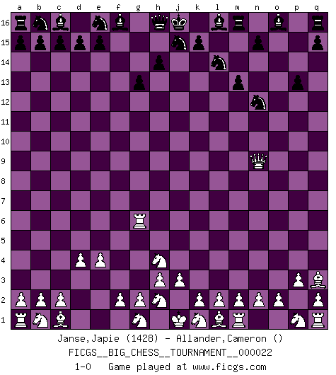 Last move : 1-0 2008 July 3 14:13:44 [Event "FICGS__BIG_CHESS__TOURNAMENT__000022"] [Site "FICGS"] [Date "2008.05.09"] [Round "1"] [White "Janse,Japie"] [Black "Allander,Cameron"] [Result "1-0"] [WhiteElo "1428"] [BlackElo ""] 1.j2-h4 h15-g13 2.e2-e4 g13-h11 3.p2-p3 j14-j13 4.e1-e3 j15-k13 5.f1-c4 h11-f10 6.h1-l4 f10-h9 7.c4-h9 k13-j11 8.h9-o15 p16-o14 9.l4-l15 k16-l14 10.l15-p11 j11-k13 11.o15-k11 j13-j12 12.k11-j12 k13-j15 13.j12-f15 g16-f14 14.f15-e16 f14-e16 15.e3-g3 o14-n12 16.p11-n9 m15-m13 17.o1-q3 p15-p13 18.d2-d4 g15-g13 19.g3-g6 1-0 This big chess game has been lost on time (started : 2008.05.09 0:37:27) Follow this game move after move (download)There is no remorse like the remorse of Chess. (H. G. Wells) Mein Name ist Rustam Kamsky. Sie haben meinen Sohn belästigt. Bereiten Sie sich aufs Sterben vor. (Rustam Kamsky) Me gusta decir que Bobby Fischer fue el mejor jugador que jamás haya existido. Pero lo que hizo de Fischer un genio, fue su habilidad de mezclar una frescura y pragmatismo Americano con ideas Rusas acerca de la estrategia. (Bruce Pandolfini) À la honte des hommes, on sait que les lois du jeu sont les seules qui soient partout justes, claires, inviolables et exécutées. Pourquoi l'Indien qui a donné les règles du jeu d'échecs est-il obéi de bon gré dans toute la terre, et que les décrétales des papes, par exemple, sont aujourd'hui un objet d'horreur et de mépris ? C'est que l'inventeur des échecs combina tout avec justesse pour la satisfaction des joueurs, et que les papes, dans leurs décrétales, n'eurent en vue que leur seul avantage. L'Indien voulut exercer également l'esprit des hommes et leur donner du plaisir; les papes ont voulu abrutir l'esprit des hommes. Voltaire (Dictionnaire philosophique / Garnier 1967) . 'gn is not allowed in chess unless n is an integer between 1 and 8 inclusive, where 1 and 8 are to interpreted as the standard numerals standing for integers in the ordered real-closed field R, with the *canonical* ordering. (As opposed to, say, an integer in the domain Z[2+i*sqrt(5)] or an integer in some exotic Grothendieck topos). (Normajean Yates)