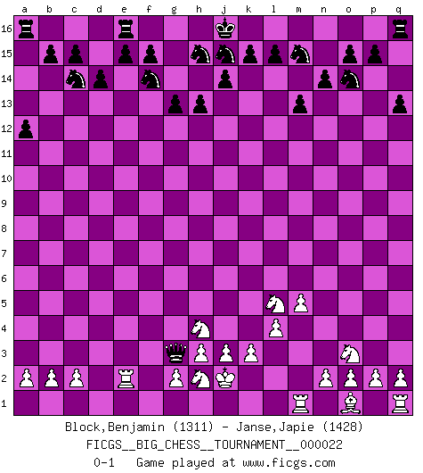 Last move : 0-1 2008 May 22 17:5:38 [Event "FICGS__BIG_CHESS__TOURNAMENT__000022"] [Site "FICGS"] [Date "2008.05.09"] [Round "1"] [White "Block,Benjamin"] [Black "Janse,Japie"] [Result "0-1"] [WhiteElo "1311"] [BlackElo "1428"] 1.d2-d4 n15-n14 2.j2-h4 p16-o14 3.e2-e4 d15-d14 4.f1-b5 m15-m13 5.c1-o12 o16-m14 6.o12-m14 m16-m14 7.h1-n6 c16-n6 8.h2-k3 l16-m15 9.b5-m15 k16-m15 10.k3-l5 n6-q9 11.k2-k3 m14-l14 12.h4-j6 g15-g13 13.l2-l4 h16-d12 14.g1-f3 h14-h13 15.b1-c3 f16-o8 16.m2-m4 q9-o11 17.f3-h4 b16-c14 18.l1-n3 d12-d4 19.a1-d1 d4-f2 20.e1-e2 f2-f4 21.k1-h2 q15-q13 22.j1-j2 g16-f14 23.m4-m5 o8-l5 24.n3-l5 l14-l5 25.j6-l5 o11-e2 26.c3-e2 f4-e4 27.d1-d2 a15-a13 28.e2-g3 e4-f4 29.d2-e2 f4-g3 30.p1-o3 a13-a12 0-1 Follow this game move after move (download)Of Chess it has been said that life is not long enough for it, but that is the fault of life, not Chess. (William Ewart Napier) Im Schach gewinnt jeder. Hat man Freunde am Spiel - und das ist die Hauptsache - ist auch der Verlust einer Partie kein Unglück. (David Bronstein) En manos de Fischer's, una diminuta ventaja teórica es tan buena como tener una Reina de ventaja. (Isaac Kashdan) Vous savez, camarade Pachman, je n'éprouve pas de plaisir à être ministre, je jouerais plutôt aux échecs comme vous, ou alors ferais une révolution au Venezuela. (Che Guevara à Ludek Pachman, 'Checkmate in Prague', 1975) Art is the triumph over chaos. (John Cheever)