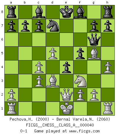 Last move : 0-1 2008 November 3 19:40:4 [Event "FICGS__CHESS__CLASS_A__000040"] [Site "FICGS"] [Date "2008.05.09"] [Round "1"] [White "Pechova,Hana"] [Black "Bernal Varela,Nelson"] [Result "0-1"] [WhiteElo "2000"] [BlackElo "2060"] 1.c4 Nf6 2.Nc3 e6 3.e4 d5 4.e5 d4 5.exf6 dxc3 6.bxc3 Qxf6 7.d4 e5 8.Nf3 Nc6 9.Bg5 Qg6 10.d5 Nb8 11.Bd3 f5 12.h4 e4 13.Qe2 Nd7 0-1 This chess game has been lost on time (started : 2008.05.09 15:36:27) English : Mikenas-Carls, Flohr variation Player Black won this chess game. Follow this game move after move (download)You cannot play at Chess if you are kind-hearted. (French Proverb) Die Leute spielen gegen mich seit 15 Jahren unter Ihren Möglichkeiten. (Robert James Fischer) Creo que una cierta cantidad de temperamento es esperada de los genios del Ajedrez. (Ron Gross) Que feriez-vous si vous étiez en train de jouer aux échecs et que la fin du monde arrive ? Je continuerais à jouer. (Saint Borromée) Depression is just anger without enthusiasm. (Unknown)