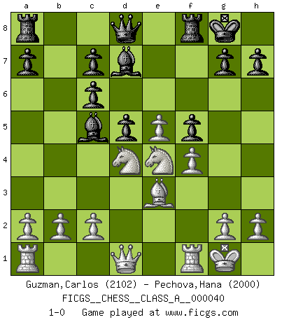 Last move : 1-0 2008 October 18 12:12:18 [Event "FICGS__CHESS__CLASS_A__000040"] [Site "FICGS"] [Date "2008.05.09"] [Round "1"] [White "Guzman,Carlos"] [Black "Pechova,Hana"] [Result "1-0"] [WhiteElo "2102"] [BlackElo "2000"] 1.e4 e5 2.Nf3 Nc6 3.d4 exd4 4.Bc4 Nf6 5.e5 d5 6.Bb5 Ne4 7.Nxd4 Bd7 8.Bxc6 bxc6 9.O-O Bc5 10.Be3 O-O 11.f3 Ng5 12.f4 Ne4 13.Nd2 f5 14.Nxe4 1-0 This chess game has been lost on time (started : 2008.05.09 15:36:27) Scotch gambit : Dubois-Reti defense Kingside Castling by player White (move 9) Kingside Castling by player Black (move 10) Player White won this chess game. Follow this game move after move (download)We must make sure that Chess will not be like a dead language, very interesting, but for a very small group. (Sytze Faber) Modernes Schach erfordert enorme Anspannung. Es ist für einen normalen Menschen unmöglich das auszuhalten. (Viktor Kortschnoi) Me dio la sensación de como si yo estuviera jugando en contra del mismo Ajedrez. - al estar jugando en contra de Robert Fischer (Walter Shipman) Aux échecs, les retours au sommet sont rares : les dommages psychologiques consécutifs à une défaite sont trop sévères. (Daily Telegraph) Every man's memory is his private literature. (Aldous Huxley)
