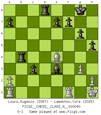 Last move : 0-1 2008 November 18 23:55:50 [Event "FICGS__CHESS__CLASS_A__000040"] [Site "FICGS"] [Date "2008.05.09"] [Round "1"] [White "Louro,Eugenio"] [Black "Lemekhov,Yura"] [Result "0-1"] [WhiteElo "2087"] [BlackElo "2025"] 1.e4 c5 2.Nc3 Nc6 3.g3 d6 4.Bg2 g6 5.d3 Bg7 6.Be3 Rb8 7.Qd2 b5 8.Nge2 b4 9.Nd1 h5 10.d4 Qa5 11.dxc5 dxc5 12.Qd5 Bd7 13.f4 Nf6 14.Qxc5 Rb5 15.Qc4 Ng4 16.e5 Ncxe5 17.fxe5 O-O 18.Qd4 Rd8 19.c3 Nxe3 20.Nxe3 Be6 21.Qh4 bxc3 22.b4 Qb6 23.Nc4 Qc7 24.Ne3 Bh6 25.Nf4 Qxe5 26.O-O Bg5 27.Nxe6 Qxe6 28.Qe4 Bxe3+ 29.Kh1 Qxe4 30.Bxe4 Rxb4 0-1 Sicilian : Closed Kingside Castling by player Black (move 17) Kingside Castling by player White (move 26) Player Black won this chess game. Follow this game move after move (download)Best by test: 1. e4 (Bobby Fischer) Du musst nicht gut spielen, es reicht, wenn du besser spielst als dein Gegner. (Anonymous) Todos los Maestros de Ajedrez fueron un día unos principiantes. (Chernev) Il a essayé de se convaincre qu'il pourrait empêcher toutes les erreurs et ne jamais perdre. L'horreur ! Gary Kasparov au sujet de Robert Fischer. There are two types of people in this world, good and bad. The good sleep better, but the bad seem to enjoy the waking hours much more. (Woody Allen)