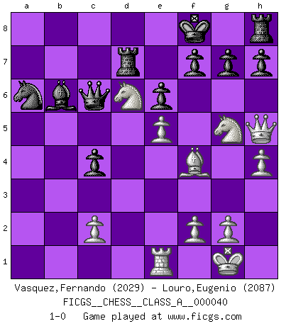 Last move : 1-0 2008 July 8 23:0:0 [Event "FICGS__CHESS__CLASS_A__000040"] [Site "FICGS"] [Date "2008.05.09"] [Round "1"] [White "Vasquez,Fernando"] [Black "Louro,Eugenio"] [Result "1-0"] [WhiteElo "2029"] [BlackElo "2087"] 1.e4 c6 2.d4 d5 3.e5 c5 4.dxc5 e6 5.Nf3 Bxc5 6.Bd3 Ne7 7.O-O Nbc6 8.Nc3 a6 9.Re1 b5 10.Bf4 Bb7 11.a3 Qc7 12.h4 Rd8 13.Qd2 Na5 14.b4 Nc4 15.Qe2 Bb6 16.a4 Nc6 17.axb5 Nxb4 18.bxa6 Bxa6 19.Rxa6 Nxa6 20.Nb5 Qc6 21.Nd6+ Kf8 22.Bxc4 dxc4 23.Ng5 Rd7 24.Qh5 1-0 Caro-Kann : Advance variation Kingside Castling by player White (move 7) Player White won this chess game. Follow this game move after move (download)The mistakes are there, waiting to be made. (Savielly Tartakower) Ein Buch ist ein Spiegel; wenn ein Affe hineinsieht, so kann kein Apostel heraus gucken. (Georg Christoph Lichtenberg) Después de la respuesta de las negras a 1.e4 con 1..e5, se quedan siempre tratando de entrar dentro del juego. (Howard Staunton) Toutes les manuvres exécutées sur une colonne ouverte ont pour but ultime l'intrusion définitive sur la septième ou la huitième rangée, en plein cur de la position ennemie. (Aaron Nimzovitch) When the going gets tactical, the computers get going. (Hyatt)