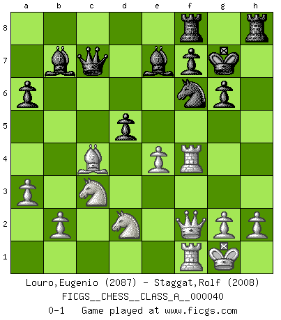Last move : 0-1 2009 March 3 10:7:22 [Event "FICGS__CHESS__CLASS_A__000040"] [Site "FICGS"] [Date "2008.05.09"] [Round "1"] [White "Louro,Eugenio"] [Black "Staggat,Rolf"] [Result "0-1"] [WhiteElo "2087"] [BlackElo "2008"] 1.d4 Nf6 2.c4 e6 3.Nf3 b6 4.a3 Ba6 5.Qc2 Bb7 6.Nc3 c5 7.e4 cxd4 8.Nxd4 Bc5 9.Nb3 Be7 10.Bf4 Nh5 11.Be3 d6 12.Be2 Nf6 13.O-O Nbd7 14.Rad1 a6 15.f4 Qc7 16.f5 e5 17.Rf3 b5 18.Rg3 g6 19.fxg6 hxg6 20.Nd2 bxc4 21.Bxc4 Kf8 22.Rf1 Kg7 23.Qd3 Nc5 24.Qe2 Ne6 25.Rgf3 Raf8 26.Qf2 Nf4 27.Bxf4 exf4 28.Rxf4 d5 0-1 This chess game has been lost on time (started : 2008.05.09 15:36:27) Queen's Indian : Petrosian system Kingside Castling by player White (move 13) Player Black won this chess game. Follow this game move after move (download)If Chess is a science, it's a most inexact one. If Chess is an art, it is too exacting to be seen as one. If Chess is a sport, it's too esoteric. If Chess is a game, it's too demanding to be just a game. If Chess is a mistress, she's a demanding one. If Chess is a passion, it's a rewarding one. If Chess is life, it's a sad one. (Unknown) Später, ... hatte ich zunehmend Erfolg in entscheidenden Partien. Vielleicht weil ich eine einfache Wahrheit erkannte: nicht nur ich hatte Angst, auch mein Gegner. (Mikhail Nekhemyevich Tal) El Ajedrez se juega con la mente... ¡no con las manos!. (Renaud y Kahn) Assurément je connaissais par expérience le mystérieux attrait de ce jeu royal, le seul entre tous les jeux inventés par les hommes qui échappe souverainement à la tyrannie du hasard, le seul où l'on ne doive sa victoire qu'à son intelligence ou plutôt à une certaine forme d'intelligence. Mais n'est-ce pas déjà le limiter injurieusement que d'appeler les échecs un jeu ? N'est-ce pas une science, un art ou quelque chose qui, comme le cercueil de Mahomet entre ciel et terre, est suspendu entre l'un et l'autre, et qui réunit un nombre incroyable de contraires ? [...] C'est une pensée qui ne mène à rien, une mathématique qui n'établit rien, un art qui ne laisse pas d'uvre, une architecture sans matière; et il l'a prouvé néanmoins qu'il était plus durable, à sa manière, que les livres ou que tout autre monument, ce jeu unique qui appartient à tous les peuples et à tous les temps, et dont personne ne sait quel dieu en fit don à la terre pour tuer l'ennui, pour aiguiser l'esprit et stimuler l'âme. Où commence-t-il, où finit-il ? (Stefan Zweig) Information on the Internet is subject to the same rules and regulations as conversation at a bar. (George Lundberg)