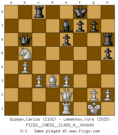 Last move : 0-1 2009 January 5 5:30:36 [Event "FICGS__CHESS__CLASS_A__000040"] [Site "FICGS"] [Date "2008.05.09"] [Round "1"] [White "Guzman,Carlos"] [Black "Lemekhov,Yura"] [Result "0-1"] [WhiteElo "2102"] [BlackElo "2025"] 1.e4 c5 2.c3 d5 3.exd5 Qxd5 4.d4 Nf6 5.Nf3 Nc6 6.dxc5 Qxc5 7.Be3 Qa5 8.Nbd2 Nd5 9.Qb3 e6 10.Nc4 Qc7 11.Bd3 Bd7 12.O-O b5 13.Ncd2 Nxe3 14.fxe3 a6 15.a4 Ne5 16.Nxe5 Qxe5 17.Rfe1 Qd6 18.Qc2 bxa4 19.Nc4 Qc7 20.Rxa4 Be7 21.Ra5 Bb5 22.Nd6+ Kf8 23.Rxb5 axb5 24.Nxb5 Qb6 25.Qf2 h5 26.b4 Rh6 27.Qe2 Rc8 0-1 This chess game has been lost on time (started : 2008.05.09 15:36:27) Sicilian : Alapin's variation (2.c3) Kingside Castling by player White (move 12) Player Black won this chess game. Follow this game move after move (download)There are tough players and nice guys, and I'm a tough player. (Bobby Fischer) Spiel ein langweiliges Spiel zu Ende und lustige Dinge können passieren. (Hans Ree) Coloca el contenido de las piezas del Ajedrez en un sombrero, agitalo vigorosamente, arrojalas en un tablero desde una altura de 30 centimetros y así obtendras el estilo de Steinitz. (H. E. Bird) On entre au jeu d'Echecs comme on entre en Religion. Pour le joueur d'Echecs, la partie d'Echecs c'est l'office, la messe, le défilé du 1er Mai, le dépôt de gerbe au Monument aux Morts. C'est un drame sacré. (Michel Roos) When you don't know what to do, walk fast and look worried. (Anonymous)