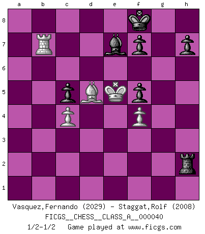 Last move : 1/2-1/2 2009 January 11 17:34:52 [Event "FICGS__CHESS__CLASS_A__000040"] [Site "FICGS"] [Date "2008.05.09"] [Round "1"] [White "Vasquez,Fernando"] [Black "Staggat,Rolf"] [Result "1/2-1/2"] [WhiteElo "2029"] [BlackElo "2008"] 1.e4 e5 2.Nf3 Nc6 3.d4 exd4 4.Nxd4 Bc5 5.Nxc6 Qf6 6.Qf3 Qxf3 7.gxf3 bxc6 8.Rg1 Ne7 9.Nc3 O-O 10.Na4 Bd4 11.c3 Bf6 12.Nc5 Ng6 13.Be3 d6 14.Nd3 a5 15.f4 Rb8 16.O-O-O Re8 17.Bg2 c5 18.e5 Be7 19.Bc6 Rd8 20.Be4 Nh4 21.c4 Be6 22.b3 a4 23.Kc2 Nf5 24.Kc3 Nd4 25.Bxd4 cxd4+ 26.Kc2 Bd7 27.Nb2 c5 28.Nxa4 Bxa4 29.bxa4 Rb4 30.Bd5 Rxa4 31.Ra1 Rb8 32.a3 g6 33.Rab1 d3+ 34.Kxd3 Rxa3+ 35.Ke4 Rxb1 36.Rxb1 dxe5 37.Rb7 Kf8 38.f5 gxf5+ 39.Kxe5 Ra2 40.f4 Rxh2 41.Rb8+ Kg7 42.Rb7 Kf8 43.Rb8+ Kg7 44.Rb7 Kf8 1/2-1/2 Scotch game Kingside Castling by player Black (move 9) Queenside Castling by player White (move 16) This chess game ended in a draw. Follow this game move after move (download)Man is a frivolous, a specious creature, and like a Chess player, cares more for the process of attaining his goal than for the goal itself. (Dostoyevsky) Kritik überlasse ich den Spießern. Ich zeige nichts, wofür ich mich schämen muss. (Alexandra Kosteniuk) Alguna parte de un error es siempre correcto. (Savielly Tartakover) Toute estimation doit être constamment réévaluée. (Jacob Estrin) The production of too many useful things results in too many useless people. (Karl Marx)
