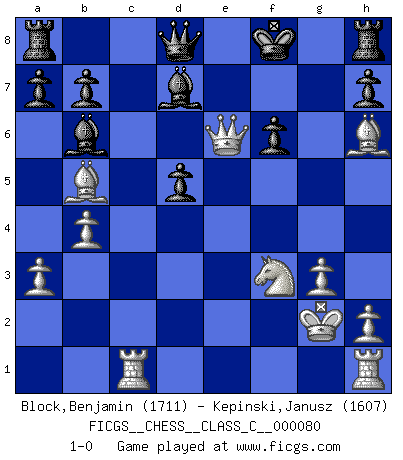 Last move : 1-0 2008 June 17 9:19:53 [Event "FICGS__CHESS__CLASS_C__000080"] [Site "FICGS"] [Date "2008.05.09"] [Round "1"] [White "Block,Benjamin"] [Black "Kepinski,Janusz"] [Result "1-0"] [WhiteElo "1711"] [BlackElo "1607"] 1.e4 e6 2.d4 d5 3.Nd2 Nf6 4.Bd3 c5 5.e5 Nfd7 6.c3 Nc6 7.Ne2 cxd4 8.cxd4 f6 9.f4 fxe5 10.fxe5 Nxd4 11.Nxd4 Qh4+ 12.g3 Qxd4 13.Nf3 Bb4+ 14.Kf1 Qc5 15.a3 Ba5 16.b4 Qc3 17.Bf4 Bb6 18.Kg2 Qb2+ 19.Bc2 Qc3 20.Qe2 Qc4 21.Bd3 Qc7 22.Rac1 Qd8 23.Bg5 Nf6 24.Bb5+ Bd7 25.exf6 gxf6 26.Qxe6+ Kf8 27.Bh6+ 1-0 French : Tarrasch, Closed variation Player White won this chess game. Follow this game move after move (download)It is not a move, even the best move that you must seek, but a realizable plan. (Eugene Znosko-Borovsky) Herr Iljumschinow ist ein etwas merkwürdiger Geschäftsmann: Er arbeitet zusammen mit Leuten wie Muammar al-Gaddafi; früher ist das Saddam Hussein gewesen. (Joel Lautier) Todo se encuentra en un estado de flujo y esto incluye al mundo del Ajedrez. (Mikhail Botvinnik) Roi des jeux et jeu des rois, les échecs portent en eux un sentiment d'infini. Ils donnent à celui qui s'est efforcé d'en approfondir les arcanes l'impression de n'être pas à la mesure de l'homme; en fait, ils constituent un résumé de l'univers, un microcosme, et figurent cette grande échelle qui, dans les plans de la lumière descend jusqu'à la matière, qui des abîmes insondables remonte jusqu'en l'infini de Dieu. (Pyrame) You must have a dream in order to have it come true. (A.P.J. Kalam)