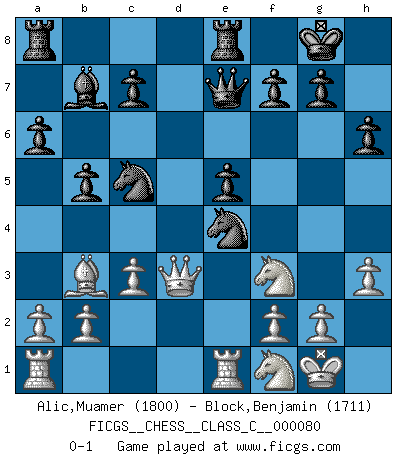 Last move : 0-1 2008 August 20 18:40:15 [Event "FICGS__CHESS__CLASS_C__000080"] [Site "FICGS"] [Date "2008.05.09"] [Round "1"] [White "Alic,Muamer"] [Black "Block,Benjamin"] [Result "0-1"] [WhiteElo "1800"] [BlackElo "1711"] 1.e4 e5 2.Nf3 Nc6 3.Bb5 a6 4.Ba4 Nf6 5.O-O Be7 6.Re1 b5 7.Bb3 O-O 8.c3 d6 9.h3 Nb8 10.d4 Nbd7 11.Bg5 Bb7 12.Nbd2 h6 13.Bh4 Re8 14.Nf1 Nxe4 15.Bxe7 Qxe7 16.dxe5 dxe5 17.Qd3 Ndc5 0-1 This chess game has been lost on time (started : 2008.05.09 22:58:14) Ruy Lopez : Closed, 7...O-O Kingside Castling by player White (move 5) Kingside Castling by player Black (move 7) Player Black won this chess game. Follow this game move after move (download)Pawns: they are the soul of this game, they alone form the attack and defense. (Philidor) Die Arbeit ist etwas Unnatürliches. Die Faulheit allein ist göttlich. (Anatole France) El Ajedrez es en su esencia, un juego. En su forma, un arte. Y en su ejecución, una ciencia. (Baron Tassilo) Les pièces de l'échiquier étaient impitoyables. Elles le retenaient, elles l'absorbaient. Il y avait de l'horreur en cela, mais aussi une harmonie unique. Car, qu'y a-t-il dans le monde, à part les échecs ? (V. Nabokov) When you stop learning you start dying. (Scott Adams)
