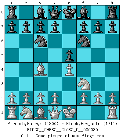 Last move : 0-1 2008 June 20 12:49:41 [Event "FICGS__CHESS__CLASS_C__000080"] [Site "FICGS"] [Date "2008.05.09"] [Round "1"] [White "Piecuch,Patryk"] [Black "Block,Benjamin"] [Result "0-1"] [WhiteElo "1800"] [BlackElo "1711"] 1.e4 e5 2.Nf3 Nc6 3.Bc4 Nf6 0-1 This chess game has been lost on time (started : 2008.05.09 22:58:14) Two knights defense Player Black won this chess game. Follow this game move after move (download)In the perfect Chess combination as in a first-rate short story, the whole plot and counter-plot should lead up to a striking finale, the interest not being allayed until the very last moment. (Yates and Winter) Je mehr wir mit Computern analysieren, desto mehr glauben wir an Verteidigung. (Vladimir Kramnik) Muchos jugadores de Ajedrez se sorprendían cuando después de la partida, Fischer explicaba con calma: 'Yo ya había analizado esta posibilidad' en una posición en la cual yo creía que no era posible de prever desde la apertura. (Mikhail Tal) Il a essayé de se convaincre qu'il pourrait empêcher toutes les erreurs et ne jamais perdre. L'horreur ! Gary Kasparov au sujet de Robert Fischer. Animated gif is worth one mega-word. (Unknown)