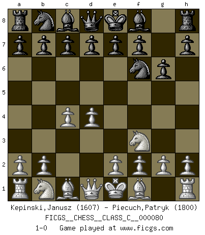 Last move : 1-0 2008 June 20 12:49:41 [Event "FICGS__CHESS__CLASS_C__000080"] [Site "FICGS"] [Date "2008.05.09"] [Round "1"] [White "Kepinski,Janusz"] [Black "Piecuch,Patryk"] [Result "1-0"] [WhiteElo "1607"] [BlackElo "1800"] 1.Nf3 Nf6 2.c4 g6 3.d4 1-0 This chess game has been lost on time (started : 2008.05.09 22:58:14) Reti Opening Player White won this chess game. Follow this game move after move (download)Why must I lose to this idiot ? (Aron Nimzovich) Weshalb minderdergeübte Spieler mit g2-g4 beginnen? Die betreffenden sind unschlüssig, ob sie nun rechts (h4) oder links (f4) beginnen sollen, und in ihrer Ratlosigkeit entschliessen sie sich nach guter Bürgerart dazu, den goldenen Mittelweg zu wählen. (Aaron Nimzowitsch) En el Ajedrez, cuando menos, el valiente hereda la tierra. (Edmar Mednis) Il (Jacob Murray) ne joue pas pour le bon coup, mais pour le meilleur. (Eloi Relange) I don't know, I don't care, and it doesn't make any difference. (Albert Einstein)