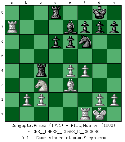 Last move : 0-1 2008 August 24 19:13:9 [Event "FICGS__CHESS__CLASS_C__000080"] [Site "FICGS"] [Date "2008.05.09"] [Round "1"] [White "Sengupta,Arnab"] [Black "Alic,Muamer"] [Result "0-1"] [WhiteElo "1791"] [BlackElo "1800"] 1.e4 c5 2.Nf3 d6 3.d4 cxd4 4.Nxd4 Nf6 5.Nc3 a6 6.Be3 e6 7.Be2 Nbd7 8.f4 Be7 9.O-O O-O 10.a4 Qc7 11.a5 b6 12.axb6 Nxb6 13.Qd3 Bb7 14.Nb3 Rfd8 15.Na5 Rac8 16.Nxb7 Qxb7 17.Rxa6 Nc4 18.Ra7 Qc6 19.Qxc4 Qxc4 20.Bxc4 Rxc4 0-1 Sicilian : Najdorf, Byrne (English) attack Kingside Castling by player White (move 9) Kingside Castling by player Black (move 9) Player Black won this chess game. Follow this game move after move (download)The hallmark of the artist is simplicity. (Larry Evans) Sie bekommen vielleicht den Eindruck, dass die Spitzenspieler überhaupt gar nicht so stark sind. Aber das stimmt nicht. Es ist eine Illusion. Mit einem Computer an der Seite ist es sehr leicht, Urteile zu fällen, aber wenn man alleine am Brett sitzt, sieht die Sache ganz anders aus. (Vladimir Kramnik) El Ajedrez es realmente noventa y nueve por ciento calculación. (Soltis) Je fais ceci parce que dans cinquante coups j'obtiendrai cela; je m'appelle Mikhail Moisevitch Botvinnik. (Botvinnik) A mistake is only a mistake if you let it happen twice. Otherwise it is a learning experience. (Daniel Parmet)