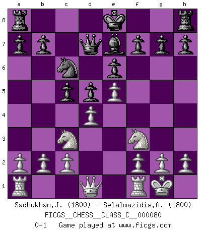 Last move : 0-1 2008 July 30 4:45:52 [Event "FICGS__CHESS__CLASS_C__000080"] [Site "FICGS"] [Date "2008.05.09"] [Round "1"] [White "Sadhukhan,Jyoti"] [Black "Selalmazidis,Arsenis"] [Result "0-1"] [WhiteElo "1800"] [BlackElo "1800"] 1.e4 e6 2.d4 d5 3.Nc3 Nf6 4.Bg5 Be7 5.Bxf6 Bxf6 6.e5 Be7 7.Nf3 c5 8.Bb5+ Bd7 9.Bxd7+ Qxd7 10.O-O Nc6 0-1 This chess game has been lost on time (started : 2008.05.09 22:58:14) French : Classical, Anderssen variation Kingside Castling by player White (move 10) Player Black won this chess game. Follow this game move after move (download)Though most people love to look at the games of the great attacking masters, some of the most successful players in history have been the quiet positional players. They slowly grind you down by taking away your space, tying up your pieces, and leaving you with virtually nothing to do ! (Yasser Seirawan) Ein Buch ist ein Spiegel; wenn ein Affe hineinsieht, so kann kein Apostel heraus gucken. (Georg Christoph Lichtenberg) Un jugador que es sorprendido, esta derrotado a medias. (Proverbio) Le succès, c'est être capable d'aller d'échec en échec sans perdre son enthousiasme. (Winston Churchill) Tomorrow's what you make of it. (Horatio Caine, C.S.I. Miami)