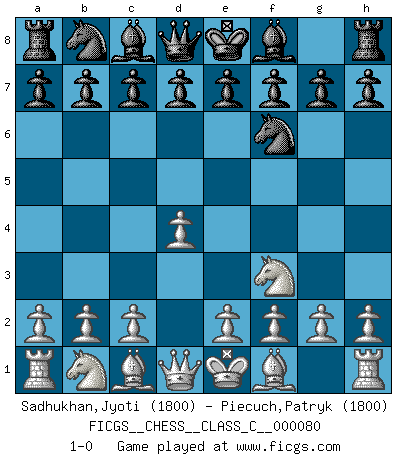 Last move : 1-0 2008 June 22 0:58:20 [Event "FICGS__CHESS__CLASS_C__000080"] [Site "FICGS"] [Date "2008.05.09"] [Round "1"] [White "Sadhukhan,Jyoti"] [Black "Piecuch,Patryk"] [Result "1-0"] [WhiteElo "1800"] [BlackElo "1800"] 1.d4 Nf6 2.Nf3 1-0 This chess game has been lost on time (started : 2008.05.09 22:58:14) Queen's pawn game Player White won this chess game. Follow this game move after move (download)Fischer prefers to enter Chess history alone. (Miguel Najdorf) Über Frauen: Chess is better. (Robert James Fischer) De todos mis libros Rusos, la defensa contiene y difunde el 'calor' mas grande que pudiese verse extraño al observar lo supremamente abstracto que el Ajedrez supuestamente es. (Vladimir Nabokov) Une platitude souvent récitée à propos des Echecs est qu'une des choses les plus difficiles à réaliser est de gagner une position gagnante. Cela ne manque pas de sens mais, pour ma part, j'ai toujours trouvé plus difficile de gagner une position perdante. (Tim Krabbe) If you work for a living, why do you kill yourself working ? (Tuco to a chicken in The Good, The Bad and The Ugly)