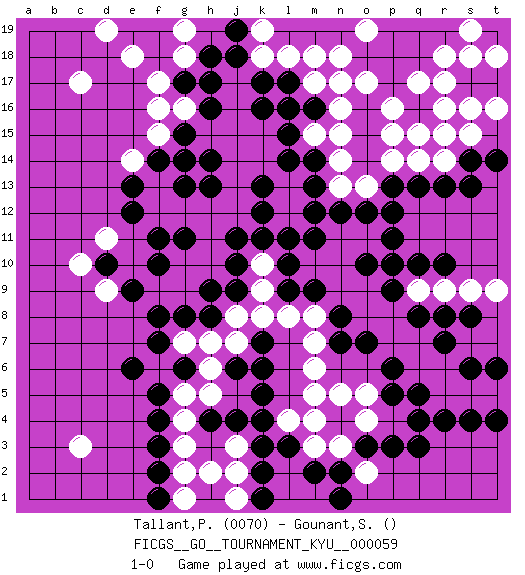 Last move : 1-0 2008 July 4 0:53:51 [Event "FICGS__GO__TOURNAMENT_KYU__000059"] [Site "FICGS"] [Date "2008.05.09"] [Round "1"] [Black "Tallant,Purity"] [White "Gounant,Stanislas"] [Result "1-0"] [Rating 1 "0070"] 1.q16 c17 2.q4 c3 3.r10 k10 4.p11 q14 5.p13 p14 6.o14 r14 7.s14 s15 8.s13 r15 9.r16 s16 10.s17 t16 11.t17 p16 12.p17 p15 13.o15 o17 14.o16 q17 15.p18 r17 16.o18 n17 17.q13 q15 18.r13 r16 19.t14 s18 20.p19 t18 21.q18 r18 22.r19 s19 23.q19 n18 24.d10 o19 25.k16 n16 26.n15 o13 27.l15 m15 28.m16 n14 29.m14 n15 30.l14 m17 31.l17 l16 32.k17 k15 33.m16 n13 34.l16 k14 35.q10 q9 36.k13 l13 37.j15 j14 38.m13 l12 39.h14 j13 40.k12 j12 41.k11 l11 42.j11 h11 43.j10 h10 44.j9 m12 45.l10 k9 46.n12 j16 47.m11 n11 48.m12 h15 49.l11 m10 50.l9 k8 51.k7 j8 52.h9 j17 53.j18 l8 54.m9 n10 55.o12 o11 56.p12 k18 57.j19 l18 58.h17 m18 59.h16 j15 60.g15 h12 61.g14 g16 62.h18 n9 63.g17 f16 64.p10 f17 65.f18 e18 66.e19 d19 67.f19 k19 68.h8 j7 69.j6 h7 70.k6 m8 71.n8 o8 72.n7 o9 73.p9 p8 74.q8 r9 75.r8 s9 76.o7 p7 77.p6 q7 78.s8 t9 79.r7 q6 80.q5 r6 81.s6 r5 82.r4 s5 83.s4 t5 84.t4 g19 85.t6 m7 86.o10 m6 87.k4 g9 88.g8 g7 89.f8 g10 90.f7 h6 91.g6 h5 92.k5 g18 93.h4 g5 94.f5 g4 95.f4 f6 96.e6 g3 97.f3 g2 98.f2 g1 99.f1 m5 100.g6 h2 101.j4 j2 102.k2 j1 103.k1 m4 104.l3 m3 105.m2 j3 106.n2 l4 107.k3 o2 108.o3 n3 109.p3 n5 110.q3 o5 111.p5 o4 112.n1 f15 113.f14 e14 114.e13 f13 115.g13 f12 116.f11 g12 117.e12 f9 118.e9 d9 119.f10 d11 120.g11 c10 121.h13 1-0 Comment by player 1 : Purity Tallant : I'm going to continue playing if you don't mind. I can only learn if I keep playing. Here are the names of the openings (joseki) played in the four corners : Corner q4 : q4 q9 Hoshi (Hwajeom, Seongjeom, Xingwei`) 4-4 Point. The star or hoshi (4-4) point, emphasizing influence at the potential expense of territory. Corner d16 : c17 j15 San-San (Sam-Sam, San-San) 3-3 Point. The San-San (3-3) point, emphasizing territory at the expense of influence. Corner d4 : c3 j9 San-San (Sam-Sam, San-San) 3-3 Point. The San-San (3-3) point, emphasizing territory at the expense of influence. Player Black won this Go (weiqi, baduk) game. Follow this game move after move (download)Stop on second, extend on third. (Anonymous) The existence of forgetting has never been proved: We only know that some things don't come to mind when we want them. (Friedrich Nietzsche)
