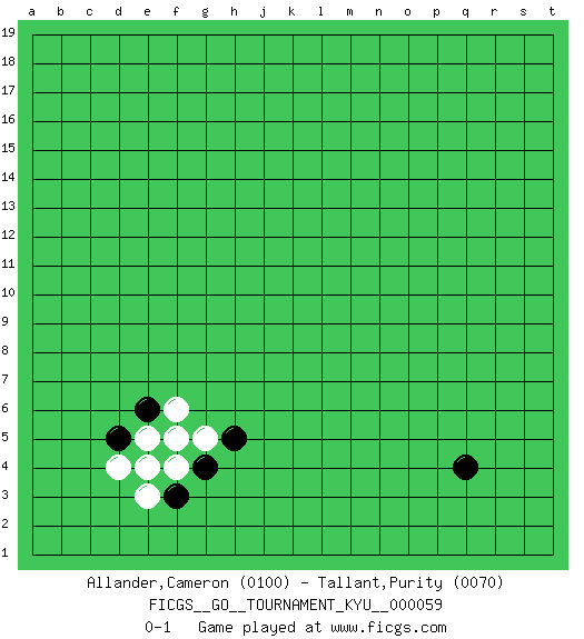 Last move : 0-1 2008 June 25 1:20:38 [Event "FICGS__GO__TOURNAMENT_KYU__000059"] [Site "FICGS"] [Date "2008.05.09"] [Round "1"] [Black "Allander,Cameron"] [White "Tallant,Purity"] [Result "0-1"] [Rating 1 "0100"] [Rating 2 "0070"] 1.q4 d4 2.e4 f4 3.f5 e5 4.g4 e3 5.f3 e4 6.e6 f6 7.d5 g5 8.h5 f5 0-1 This go game has been lost on time (started : 2008.05.09 23:4:24) Here are the names of the openings (joseki) played in the four corners : Corner d4 : d4 e4 Hoshi (Hwajeom, Seongjeom, Xingwei`) 4-4 Point. The star or hoshi (4-4) point, emphasizing influence at the potential expense of territory. Player White won this Go (weiqi, baduk) game. Follow this game move after move (download)Everything happens on a grid-engraved board with black and white pieces, but if that's all you see then you don't know Go. (Pierre Audouard) A good book on your shelf is a friend that turns its back on you and remains a friend. (Author unknown)