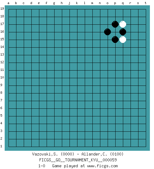 Last move : 1-0 2008 June 25 1:20:38 [Event "FICGS__GO__TOURNAMENT_KYU__000059"] [Site "FICGS"] [Date "2008.05.09"] [Round "1"] [Black "Vazovski,Sergey"] [White "Allander,Cameron"] [Result "1-0"] [Rating 1 "0000"] [Rating 2 "0100"] 1.q16 q15 2.p15 p16 3.p17 q17 4.o16 1-0 This go game has been lost on time (started : 2008.05.09 23:4:24) Here are the names of the openings (joseki) played in the four corners : Corner q16 : q16 q15 Hoshi (Hwajeom, Seongjeom, Xingwei`) 4-4 Point. The star or hoshi (4-4) point, emphasizing influence at the potential expense of territory. Player Black won this Go (weiqi, baduk) game. Follow this game move after move (download)Dead group ? Always win ko fights ! (Anonymous) Locking firmely the window serves nothing, only small thiefs pass through there, the big thiefs enter through the front door. (Luc-Olivier Leclerc)