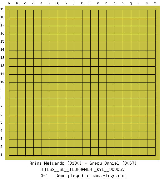 Last move : 0-1 2008 June 8 23:55:9 [Event "FICGS__GO__TOURNAMENT_KYU__000059"] [Site "FICGS"] [Date "2008.05.09"] [Round "1"] [Black "Arias,Meldardo"] [White "Grecu,Daniel"] [Result "0-1"] [Rating 1 "0100"] [Rating 2 "0067"] 0-1 This go game has been lost on time (started : 2008.05.09 23:4:24) Here are the names of the openings (joseki) played in the four corners : Player White won this Go (weiqi, baduk) game. Follow this game move after move (download)Very few good moves are played. (Pierre Audouard) If you know the enemy and know yourself you need not fear the results of a hundred battles. (Sun Tzu)