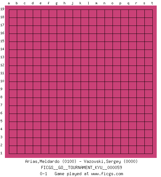 Last move : 0-1 2008 June 8 23:55:9 [Event "FICGS__GO__TOURNAMENT_KYU__000059"] [Site "FICGS"] [Date "2008.05.09"] [Round "1"] [Black "Arias,Meldardo"] [White "Vazovski,Sergey"] [Result "0-1"] [Rating 1 "0100"] [Rating 2 "0000"] 0-1 This go game has been lost on time (started : 2008.05.09 23:4:24) Here are the names of the openings (joseki) played in the four corners : Player White won this Go (weiqi, baduk) game. Follow this game move after move (download)Keshi is worth as much as an invasion ! (Anonymous) Depression is just anger without enthusiasm. (Unknown)