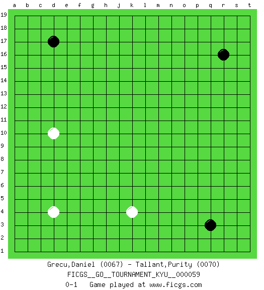 Last move : 0-1 2008 June 15 0:15:40 [Event "FICGS__GO__TOURNAMENT_KYU__000059"] [Site "FICGS"] [Date "2008.05.09"] [Round "1"] [Black "Grecu,Daniel"] [White "Tallant,Purity"] [Result "0-1"] [Rating 1 "0067"] [Rating 2 "0070"] 1.r16 d4 2.d17 k4 3.q3 d10 0-1 This go game has been lost on time (started : 2008.05.09 23:4:24) Here are the names of the openings (joseki) played in the four corners : Corner d4 : d4 0-1 Hoshi (Hwajeom, Seongjeom, Xingwei`) 4-4 Point. The star or hoshi (4-4) point, emphasizing influence at the potential expense of territory. Player White won this Go (weiqi, baduk) game. Follow this game move after move (download)The game plays itself, the players don't control it. (Pierre Audouard) You think that education is too expensive ? Try ignorance. (Derek Bok)